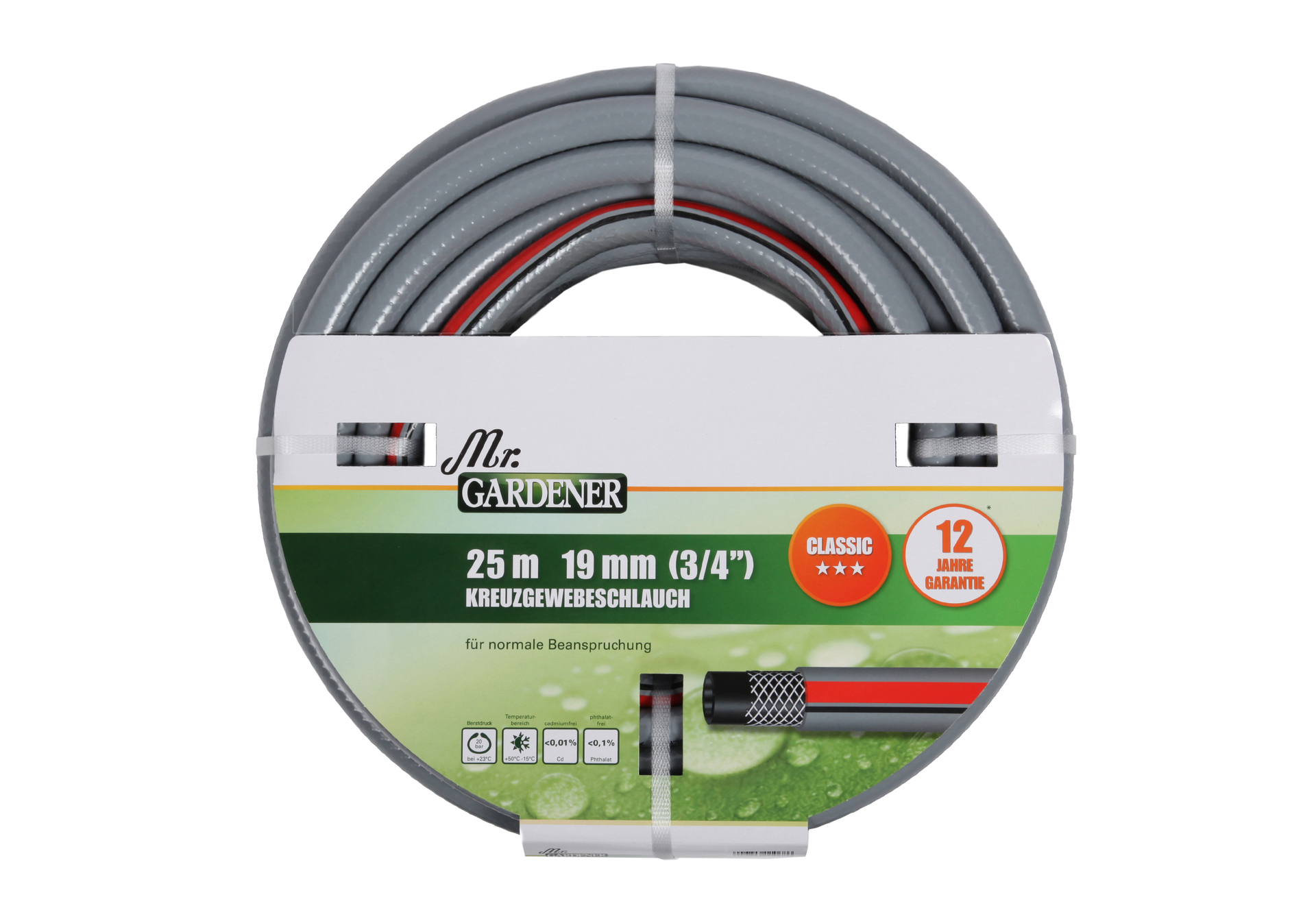 Der classic Gartenschlauch 25 m (19 mm, 3/4″) ist mit einem Kreuzgewebe verstärkt. Der Schlauch ist für eine normale Beanspruchung ausgelegt und cadmiumfrei sowie phthalatfrei. Der Berstdruck beträgt 20 bar bei +23°C. Einsetzbar ist der Schlauch innerhalb eines Temperaturbereiches zwischen -15°C und +50°C.