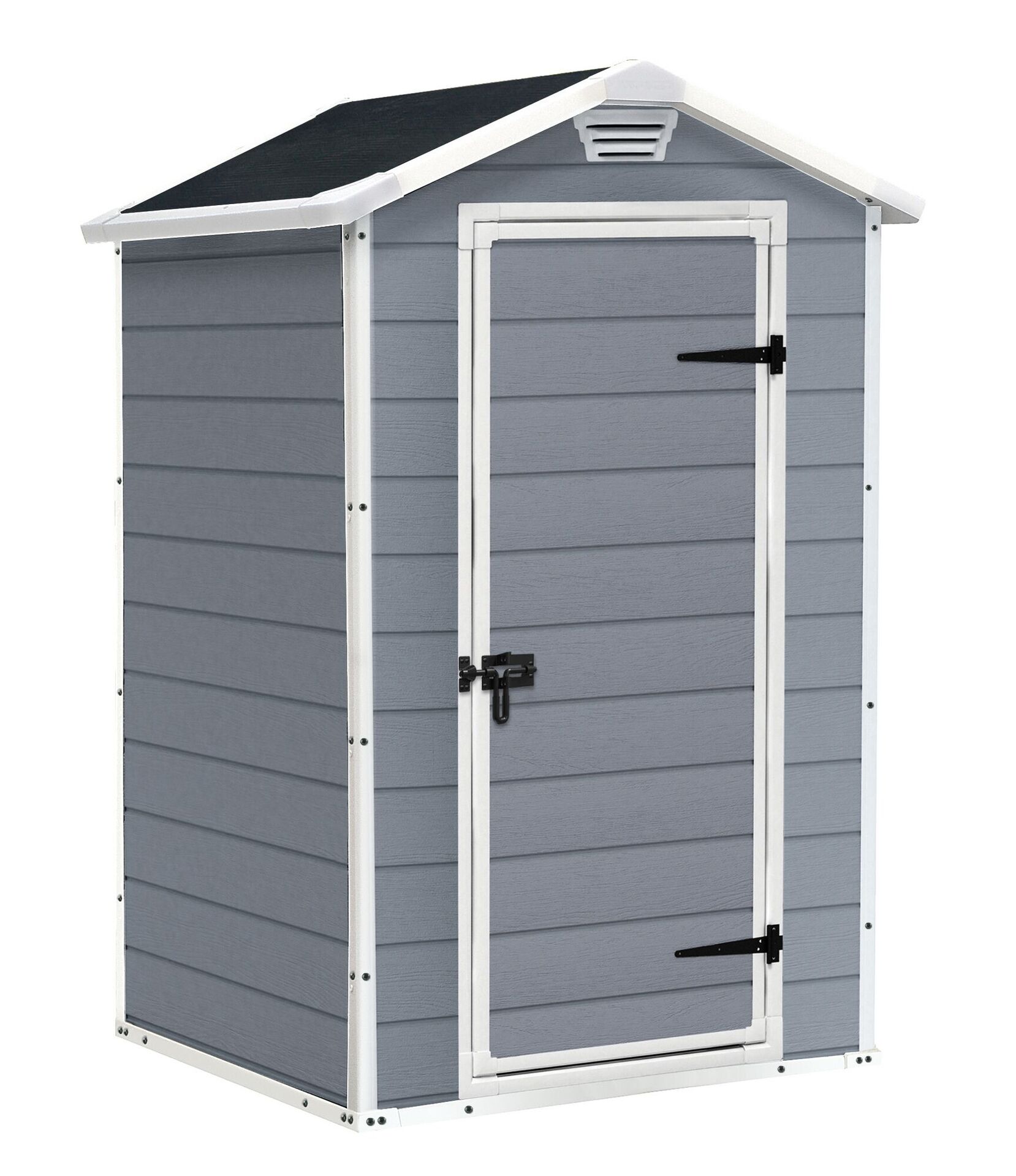– Breite: 129, – Farbe: Grau / Weiß, – Gewicht: 29, – Höhe: 196, – Länge: 103, – Material: Polypropylen, – Produktart: Gartenhaus