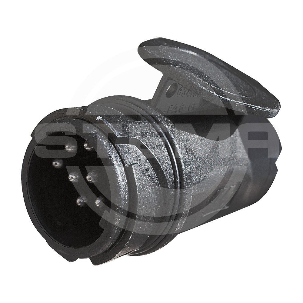 Kupplungsstecker für gängige ungebremste Anhänger mit 12-Volt-Anlage. Er ist 7-polig Kunststoffgehäuse mit Zweilochtülle. Steckkontakte für Kabel mit Kabelschuhen. Der Kupplungsstecker aus schwarzem Kunststoff besitzt 7 Pole.