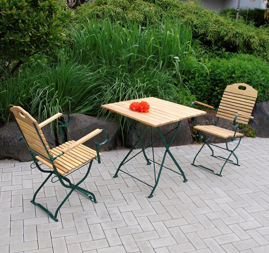 Kurgarten – Garnitur 3-teilig ( 2x Armlehnensessel, 1x Tisch 70x70cm quadratisch), Gestell Flachstahl moosgrün , Latten Robinie, klappbar