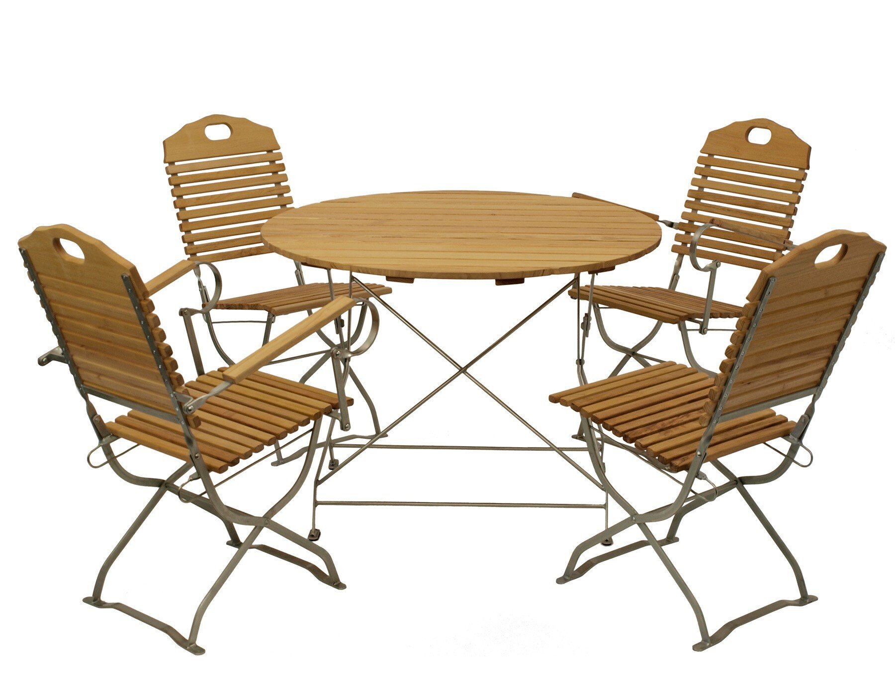 Kurgarten – Garnitur 5-teilig (2x Stuhl, 2x Armlehnensessel, 1x Tisch 100cm rund), Gestell Flachstahl verzinkt + transparent pulverbeschichtet, Latten Robinie, klappbar