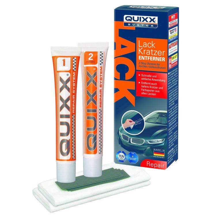 Das TÜV geprüfte QUIXX Repair System entfernt Kratzer, kleinere Schrammen und Farbspuren schnell und zuverlässig aus Lacken (auch Metallic) von Autos, Motorrädern, Wohnmobilen oder Booten. Mit zwei unterschiedlichen Spezialpolituren können sowohl leichte als auch tiefere Kratzer beseitigt werden. Einfach die Paste auftragen und polieren. Durch die überlegene Wirkung von QUIXX erstrahlt der Lack in neuem Glanz.