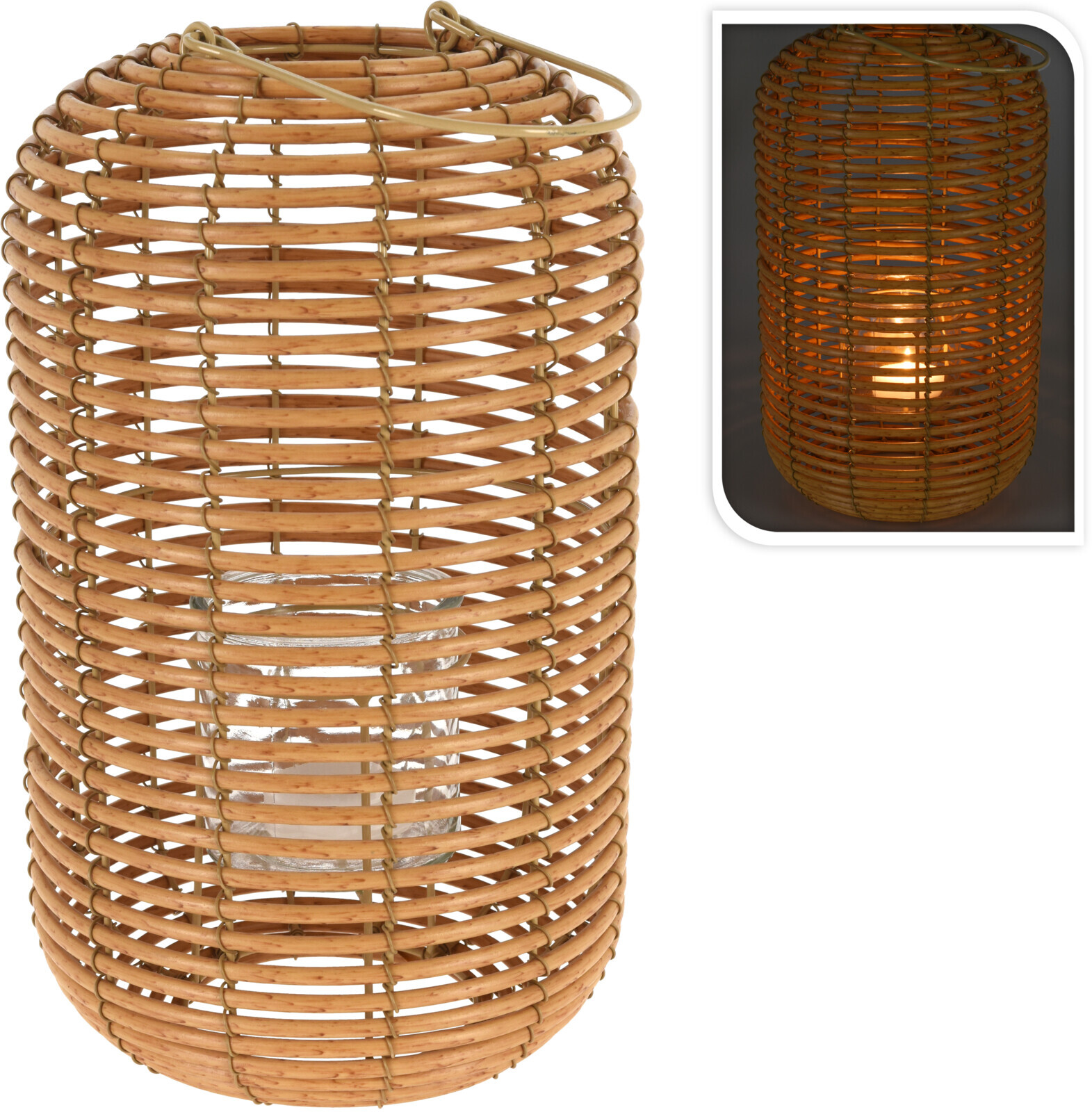 Runde Laterne aus Geflecht mit Glaszylinder, natur