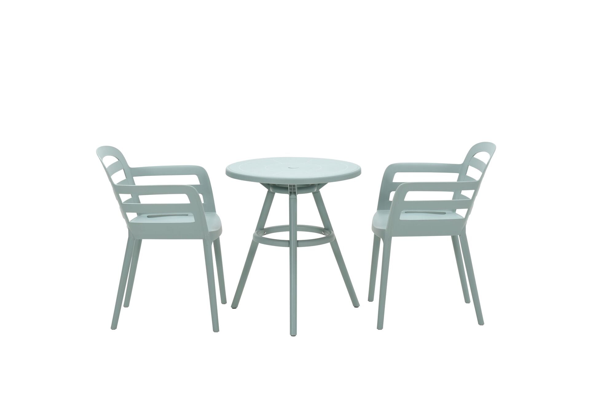 – ausziehbar: Nein, – Farbe: soft green, – Form: rund, – geeignet für x Personen: 2, – Maße: 60x63x70 cm (LxBxH), – Material: Kunststoff, – Pflege: Schwamm, Seifenlauge, – Tischplatte: Ø: 60 cm, – Weitere Eigenschaften: mit Sonnenschirmloch, – witterungsbeständig: Ja, – zusammenklappbar: Nein