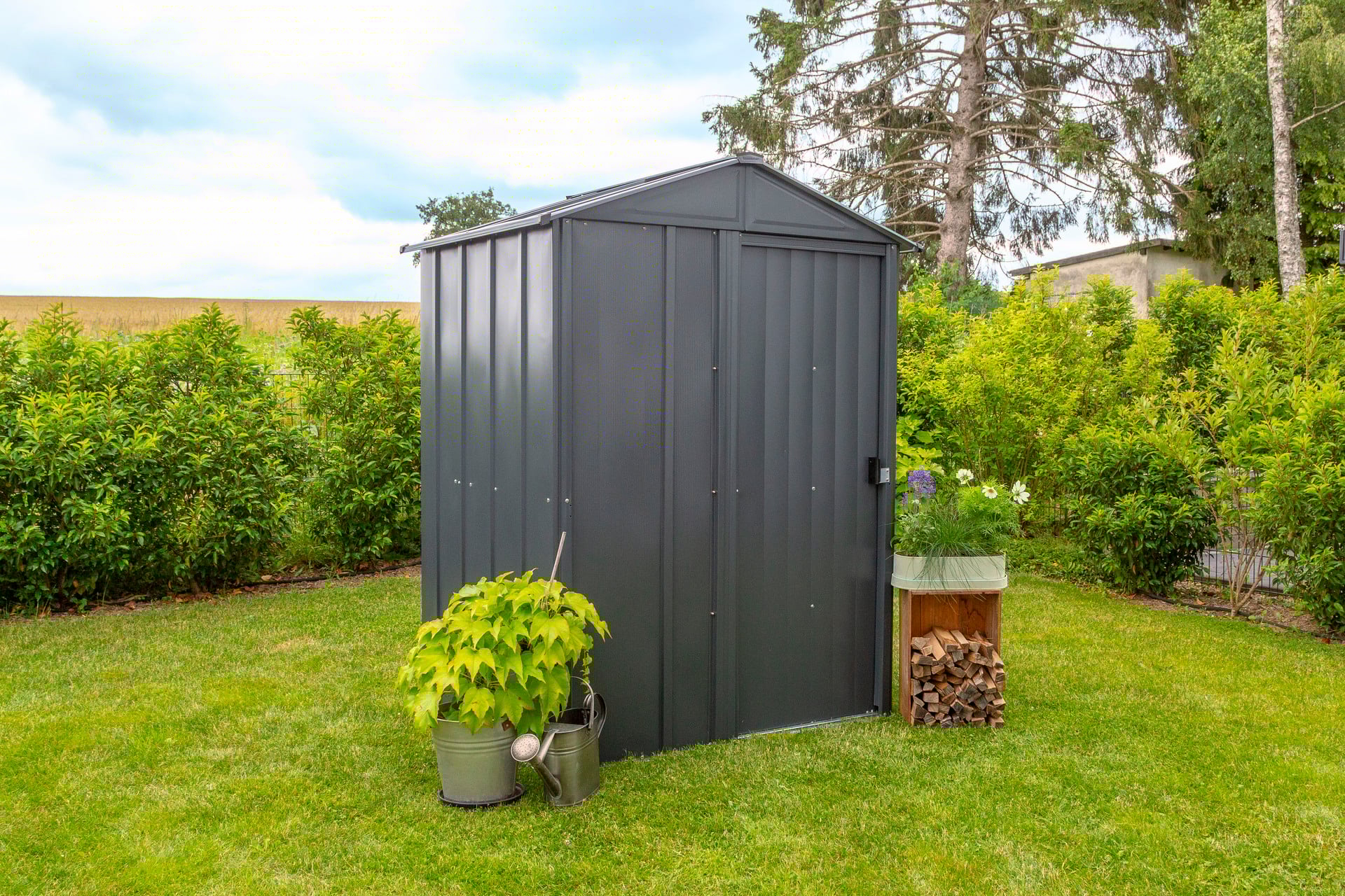 Das zeitlose Metallgerätehaus mit elektrolytisch verzinktem Stahlblech bietet Ihnen eine stabile Konstruktion, welche rostresistent und kratzfest ist.
