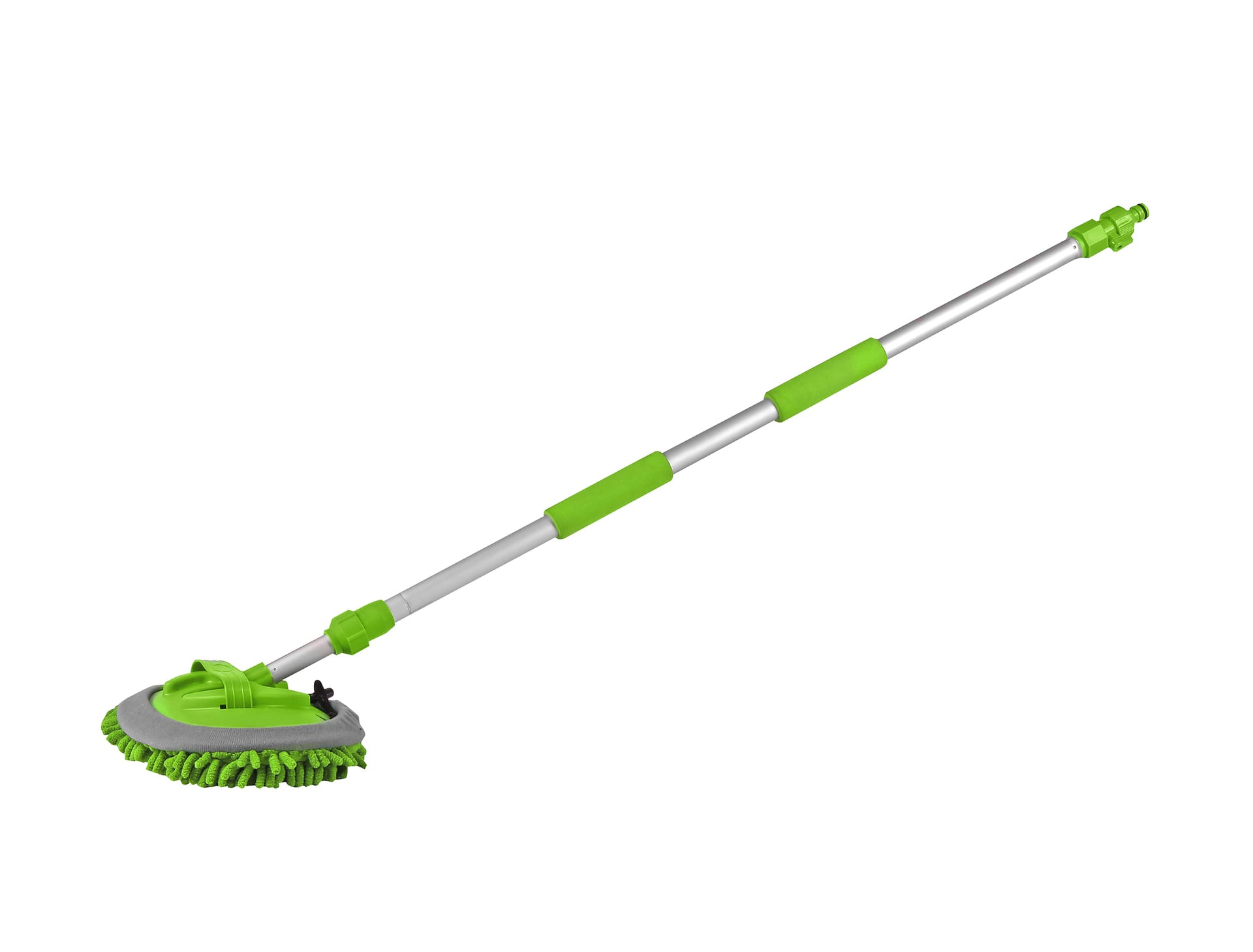 Mikrofaser Waschmopp für die besonders schonende Reinigung von Wohnmobil, Wohnwagen, Auto, Bus, Lkw und Boot. Kann nass oder trocken verwendet werden. Waschkopf kann auch ohne die Teleskopstange als Bürste benutzt werden. Teleskopstange kann von 95 cm auf maximal 170 cm verlängert werden. Mit Schlauchanschluss
