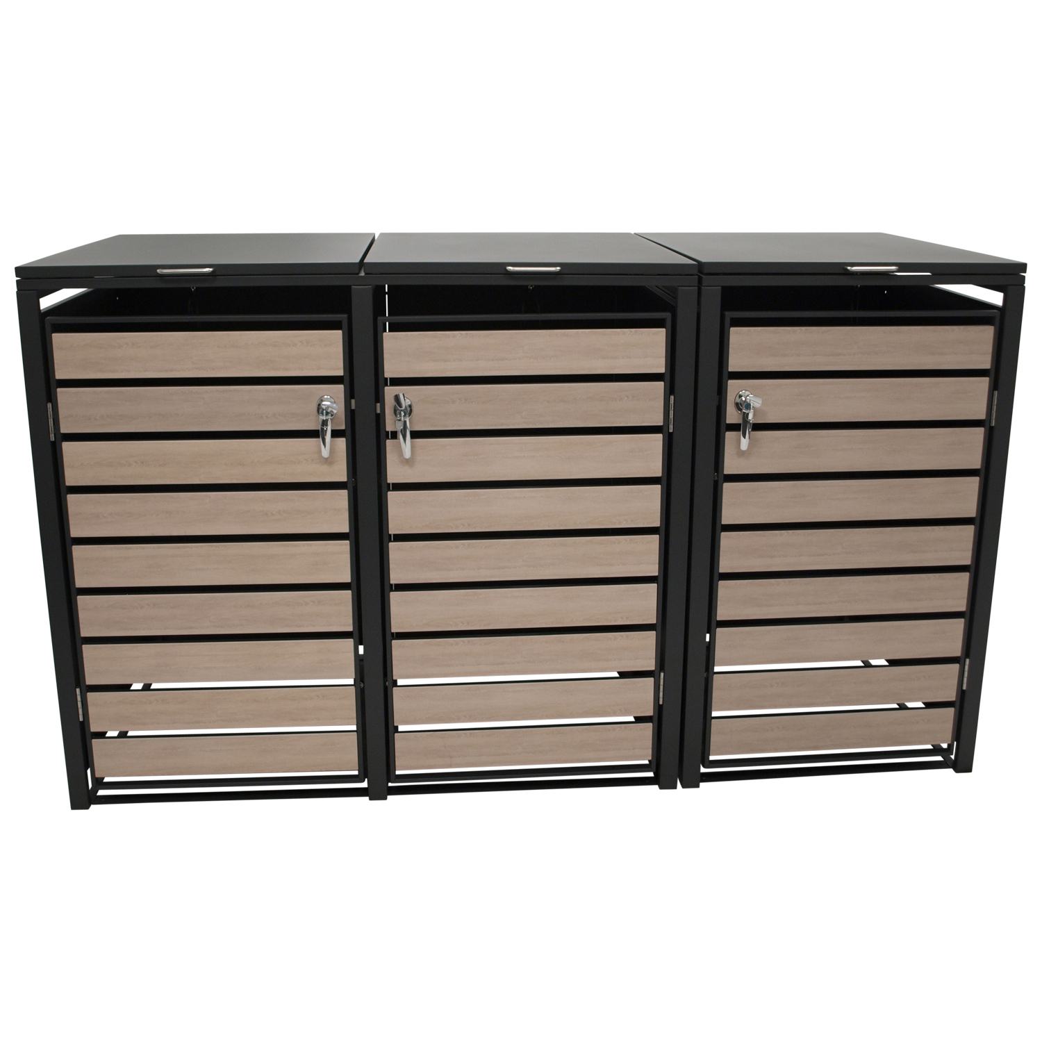 Mülltonnenbox für drei Tonnen bis 240L. Aus verzinktem Stahl, anthrazitfarben pulverbeschichtet. Front in Holzoptik. Deckel mit 2 Gasdruckfedern.