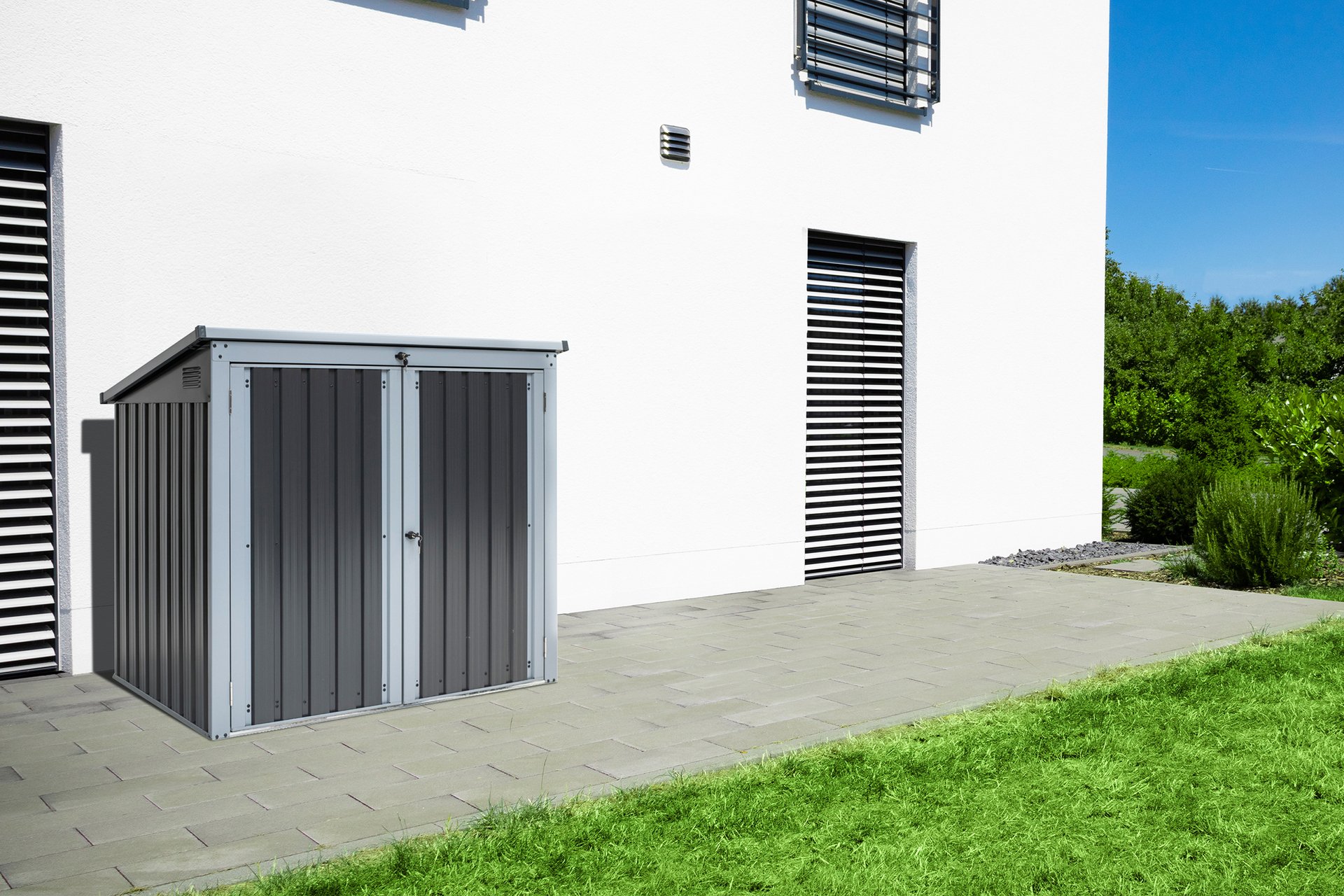 Müheloses und sicheres Öffnen des Deckels mithilfe von Gasdruckfedern. Extra breite Tür (BxH 135×124 cm) für einfachen Zugang und bequemes rangieren von Mülltonnen.