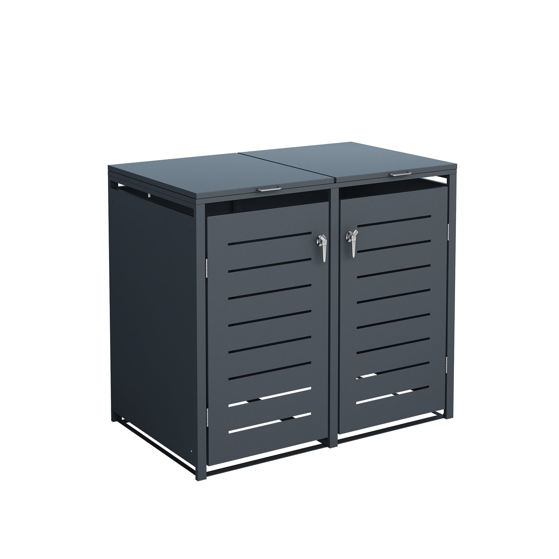 Mülltonnenbox für zwei Tonnen bis 240L. Aus verzinktem Stahl, anthrazitfarben pulverbeschichtet. Deckel mit 2 Gasdruckfedern.