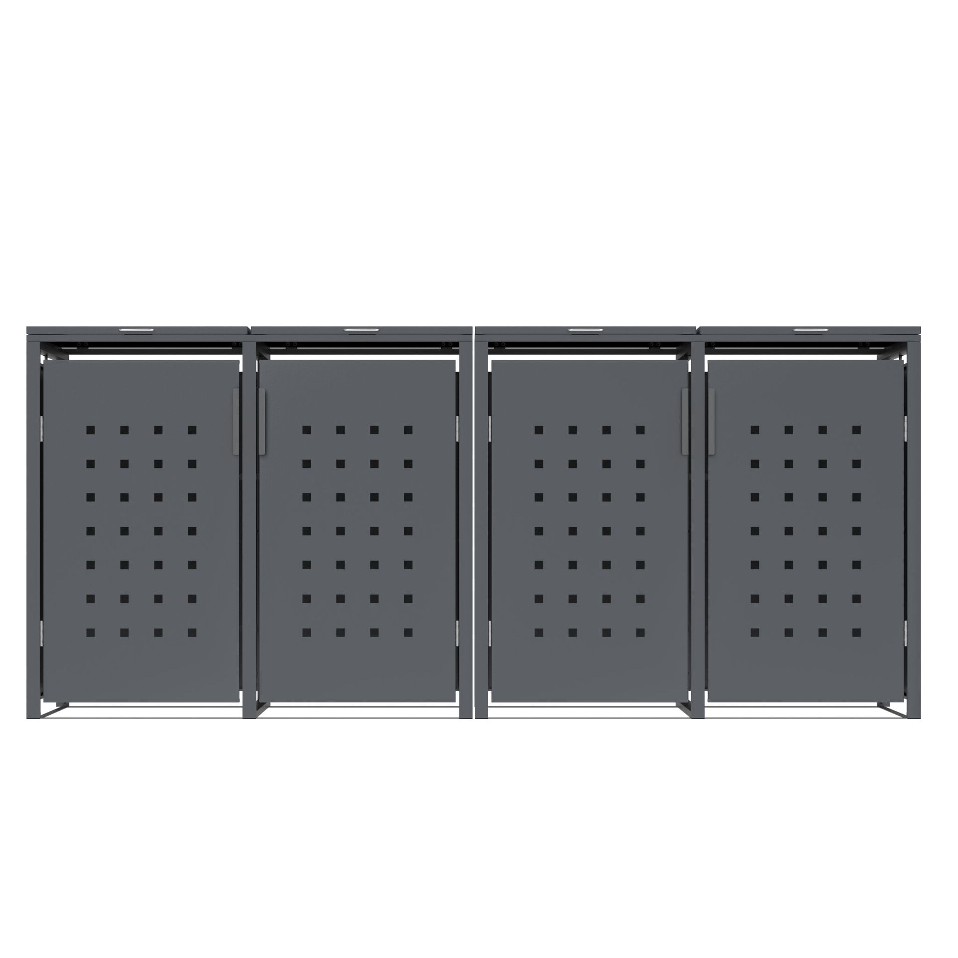 Mülltonnenbox für 4 Tonnen aus verzinktem Stahl, anthrazitfarben pulverbeschichtet, 264×80×116cm. Passend für 120L und 240L Tonnen (Standardgröße). Deckel mit Gasdruckdämpfer + Klappenband für automatische Öffnung, rostfreie Beschläge, Türe mit Magnetverschluss.