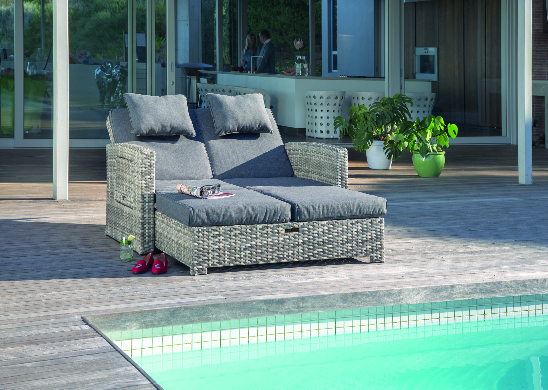 Die Liege verfügt zudem über 2 hochklappbare Seitentische, die Platz für Getränke, Bücher oder Sonnencreme bieten. Das Fußteil der Liege kann ausgezogen werden und verwandelt die Liege in ein Sofa oder Bett. Die Liege wird inklusive Auflagen und 2 Nackenkissen in anthrazit geliefert.