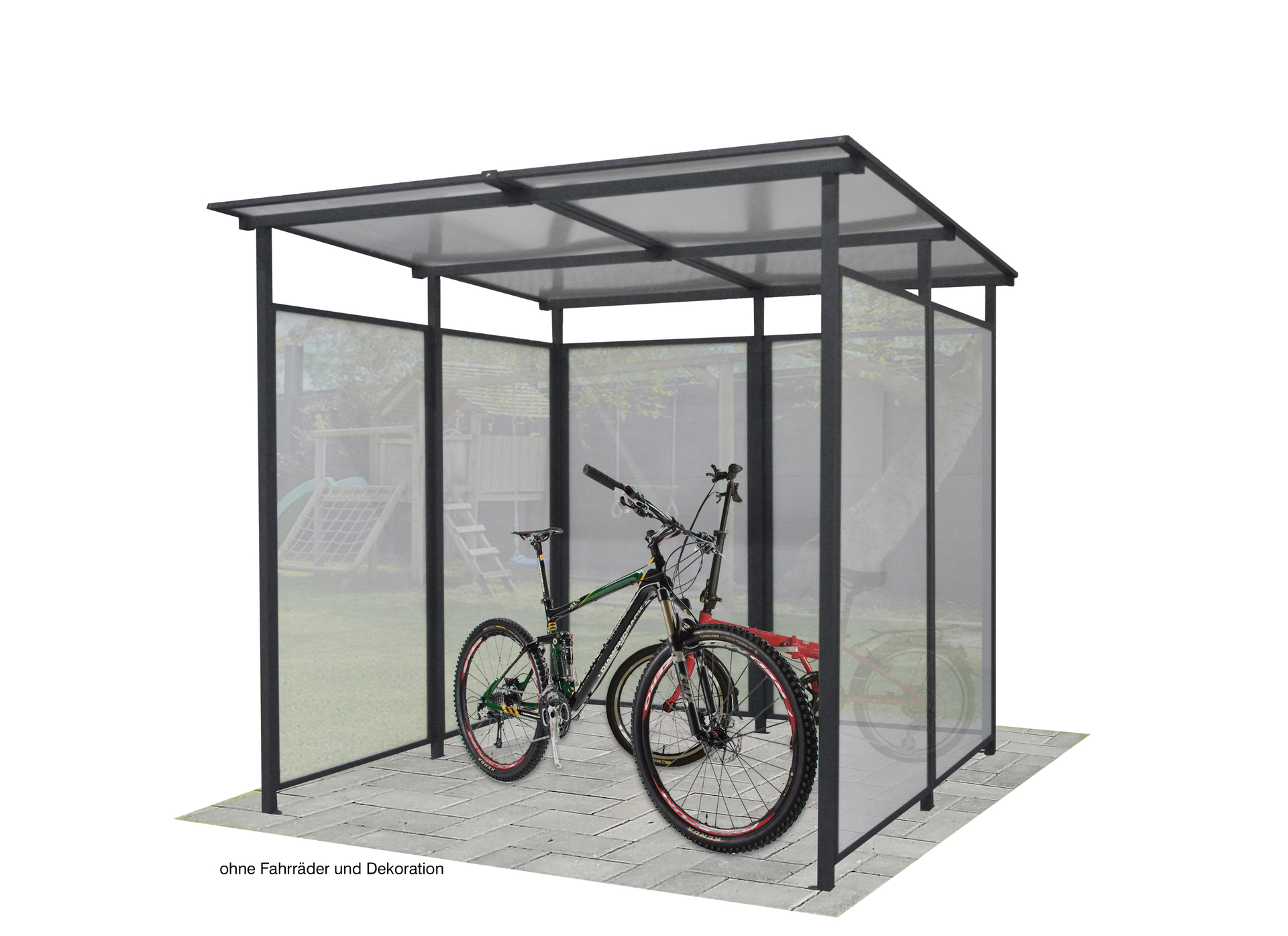 Der Multifunktionsunterstand ist vielseitig verwendbar, z. B. als Fahrradunterstand, als Mülltonengarage, als Raucherunterstand oder als Überdachung für Gartenmöbel. Der Unterstand besteht aus einem stabilen Rahmen aus Aluminiumprofilen und ist mit schlagfesten sowie UV-resistenten Doppelsteg-Platten eingedeckt. Die Platten der Seitenteile haben eine Stärke von 6 mm, die Dachplatten sind 8 mm stark.