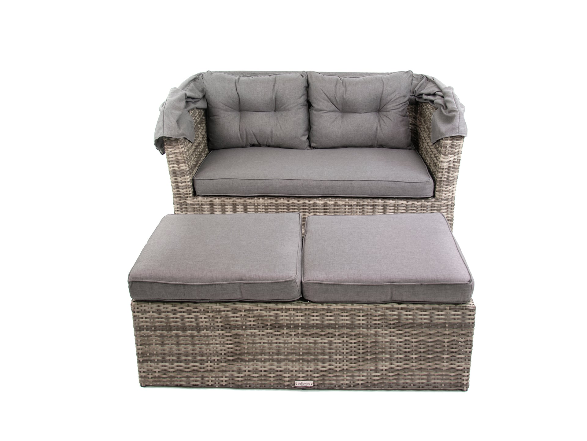– Farbe: beige/grau, – Im Set enthalten: Lounge mit Dach, Fußteil, Auflagen, – Maße: 138x80x145cm (LxHxB), – Material: Gestell: Aluminium, Geflecht: Polyrattan, Auflagen: 100% Polyester, – Produktart: Lounge