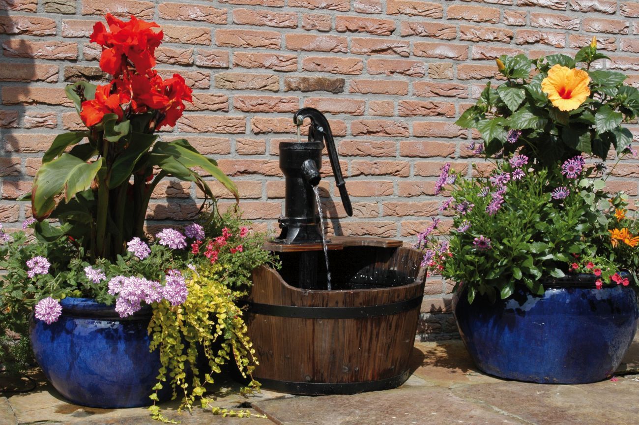 Holzfass, rustikales Wasserspiel mit Schwengelpumpe,