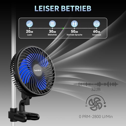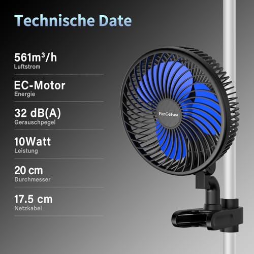 FanGoFast Upgrade Grow Clip-Ventilator Oszillierend, EC Motor mit 10-Geschwindigkeiten, Grow Ventilator Klemmbar für growzelt, 20cm Durchmesser, 10W, 561m³/h...