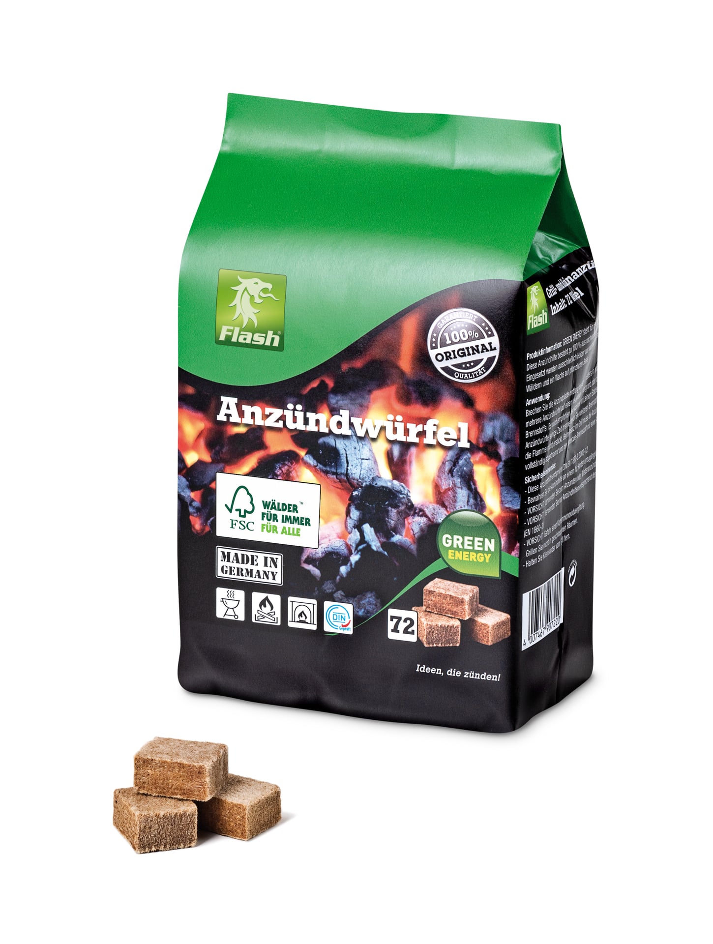 Öko-Anzündwürfel aus Holz & Wachs zum sicheren und geruchsarmen Anzünden von Grill, Ofen und Kamin. FSC®-zertifiziertes Produkt im Papierbeutel. Entspricht DIN EN 1860-3.