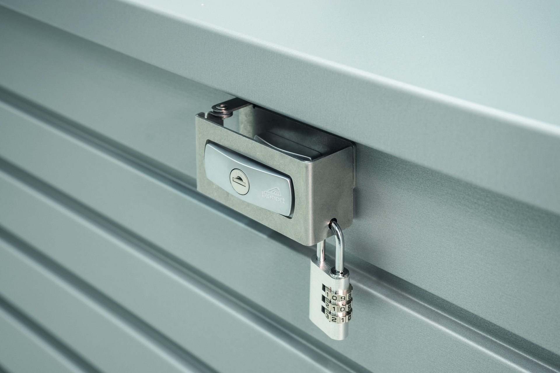 Umrüstsatz von FreizeitBox auf PaketBox, bestehend aus: Edelstahl-Verschlussbügel und Edelstahl-Vorhangschloss mit Ziffernkombination, Edelstahl-Sicherungsseil (3 Meter langes, kunststoffummanteltes und kürzbares Edelstahlseil mit einer Kunsstoffkugel am Ende sichert die PAKET-BOX gegen Diebstahl), Namensaufkleber mit Bedienungsanleitung für Paketzusteller.