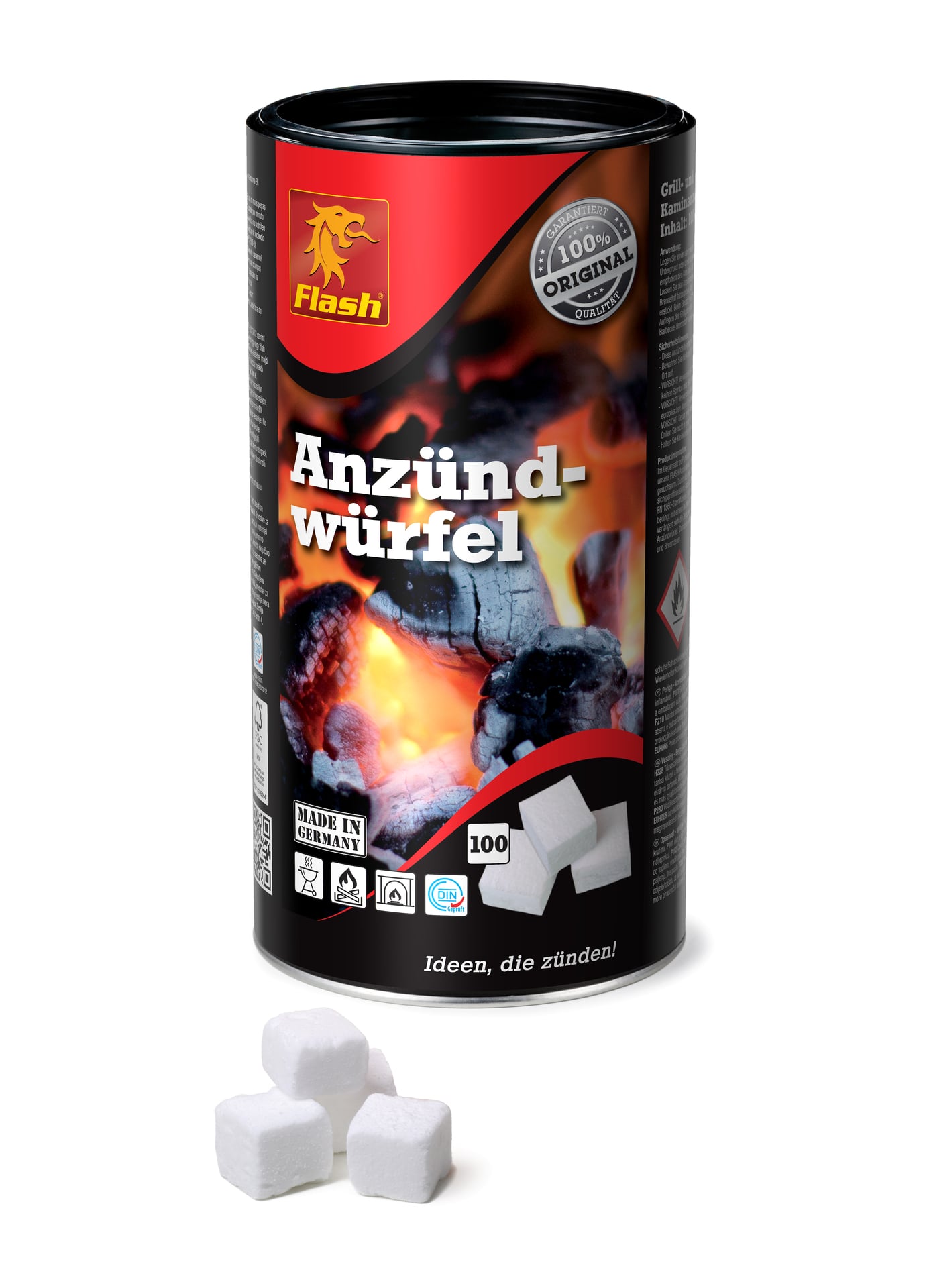Anzündwürfel auf Paraffinbasis zum sicheren und geruchsarmen Anzünden von Grill, Ofen und Kamin. Wiederverschließbare Vorratsdose. Entspricht DIN EN 1860-3.