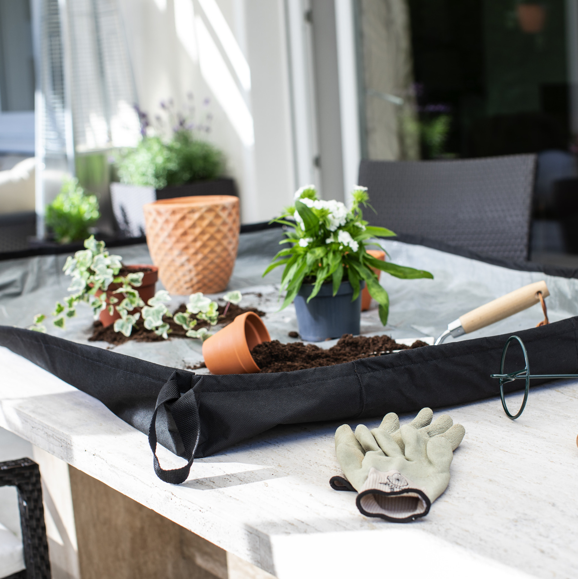 Perfekt für Balkon und Haus! Diese praktische Arbeitsunterlage ermöglicht ein Bepflanzen und Umtopfen, ohne dass danach der Boden mühsam gereinigt werden muss. Die Plane wird dabei einfach auf den Boden oder einen Tisch gelegt und die Ecken mithilfe der Druckknöpfe aufgeklappt – schon kann es losgehen. Auf der großzügigen Arbeitsfläche von 150 cm x 100 cm kann mit großen und kleinen Pflanzen gearbeitet werden. Die robuste Unterlegplane kann im Außen- sowie im Innenbereich verwendet werden. So können Sie Zimmerpflanzen direkt im Haus umtopfen und die Matte mithilfe der vier Griffe anschließend einfach entleeren, ohne Schmutz zu hinterlassen. Die Unterlegplane schützt den Boden dabei nicht nur vor Verschmutzungen durch Erde, sondern vermindert dank Vlies an der Unterseite auch das Risiko von Kratzer und andere Schäden. Auch den Balkon hält die Pflanz- und Unterlegplane sauber. Nach getaner Arbeit können Sie die wasserabweisende Plane entleeren, abwischen und anschließend platzsparend zusammenlegen und verstauen.