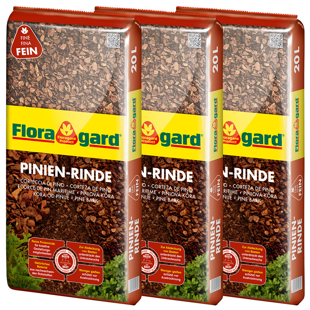 Floragard Pinien-Rinde ist ein naturbelassener Bodenbelag erhältlich in den unterschiedlichen Absiebungen super-fein, fein, mittel und grob. Sie unterdrückt auf natürliche Weise lästigen Unkrautwuchs, der Boden bleibt gleichmäßig feucht, die Pflanzen müssen seltener gegossen werden. Neuanpflanzungen wachsen besser an.
