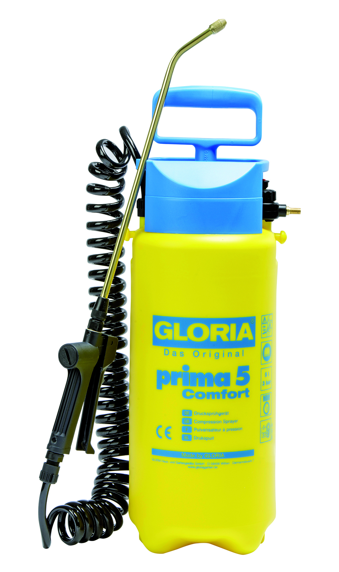 Die GLORIA prima 5 Comfort ist ein zuverlässiges Drucksprühgerät mit dem Plus an Komfort und Flexibilität. Mit einem Fassungsvermögen von 5 Liter, einer leistungsstarken Druckpumpe sowie einem maximalen Betriebsdruck von 3 bar ist das Gerät ein zuverlässiger Helfer bei der Gartenarbeit. Mit einem 2,5 Meter langen Spiralschlauch bietet die prima 5 Comfort ein deutliches Plus an Reichweite beim Sprühen und dank des Anschlussventils für einen externen Kompressor ist auch ein automatischer Druckaufbau ohne manuelles Pumpen möglich.