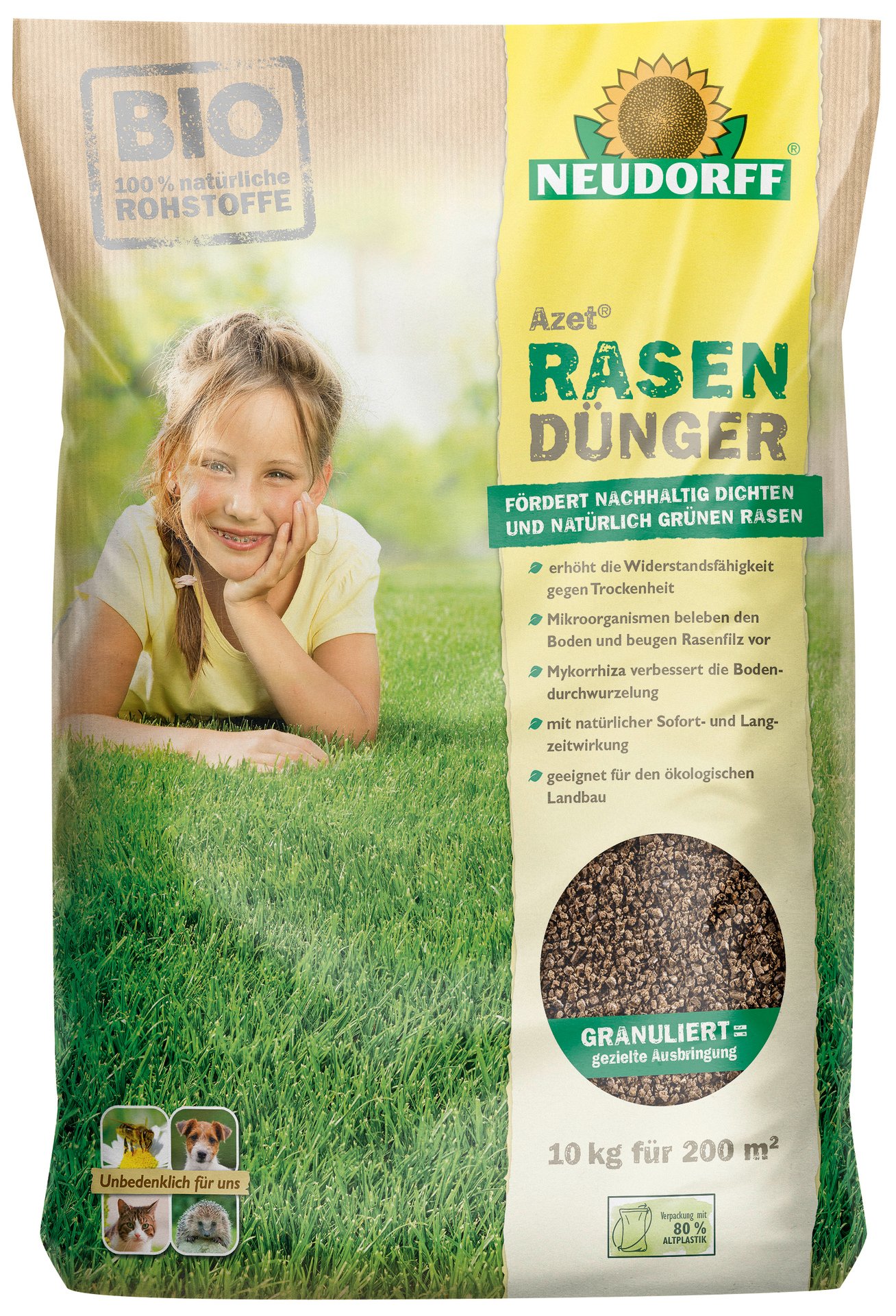 Wer wünscht sich das nicht? – dichte und natürlich grüne Rasenflächen, die Moos und Unkraut verdrängen. Das wird nur mit dem organischen NPK-Dünger 9-3-5 mit sofortiger und lang anhaltender Wirkung möglich. Die bodenbelebenden Mikroorganismen und MyccoVital des Rasendüngers sorgen für kräftige Wurzeln und verspricht Widerstandsfähigkeit gegen Trockenheit und Frost.