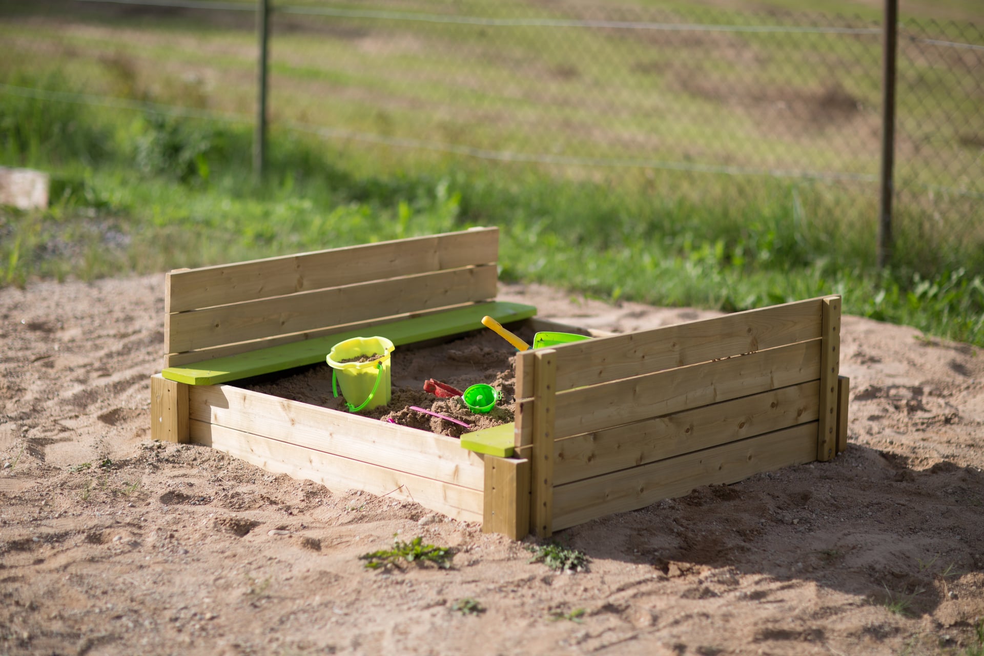Kinder in allen Altersklassen können sich im Sandkasten entfalten. Die Sandgrube ist kompakt und hat alles was man braucht. Im Lieferumfang sind zwei Holzabdeckungen enthalten, welche den Sand nach dem Spielspaß vor Regen oder Laub schützen sollen. Während der Benutzung können die Holzabdeckungen als Sitzlehnen genutzt und somit platzsparend verstaut werden.