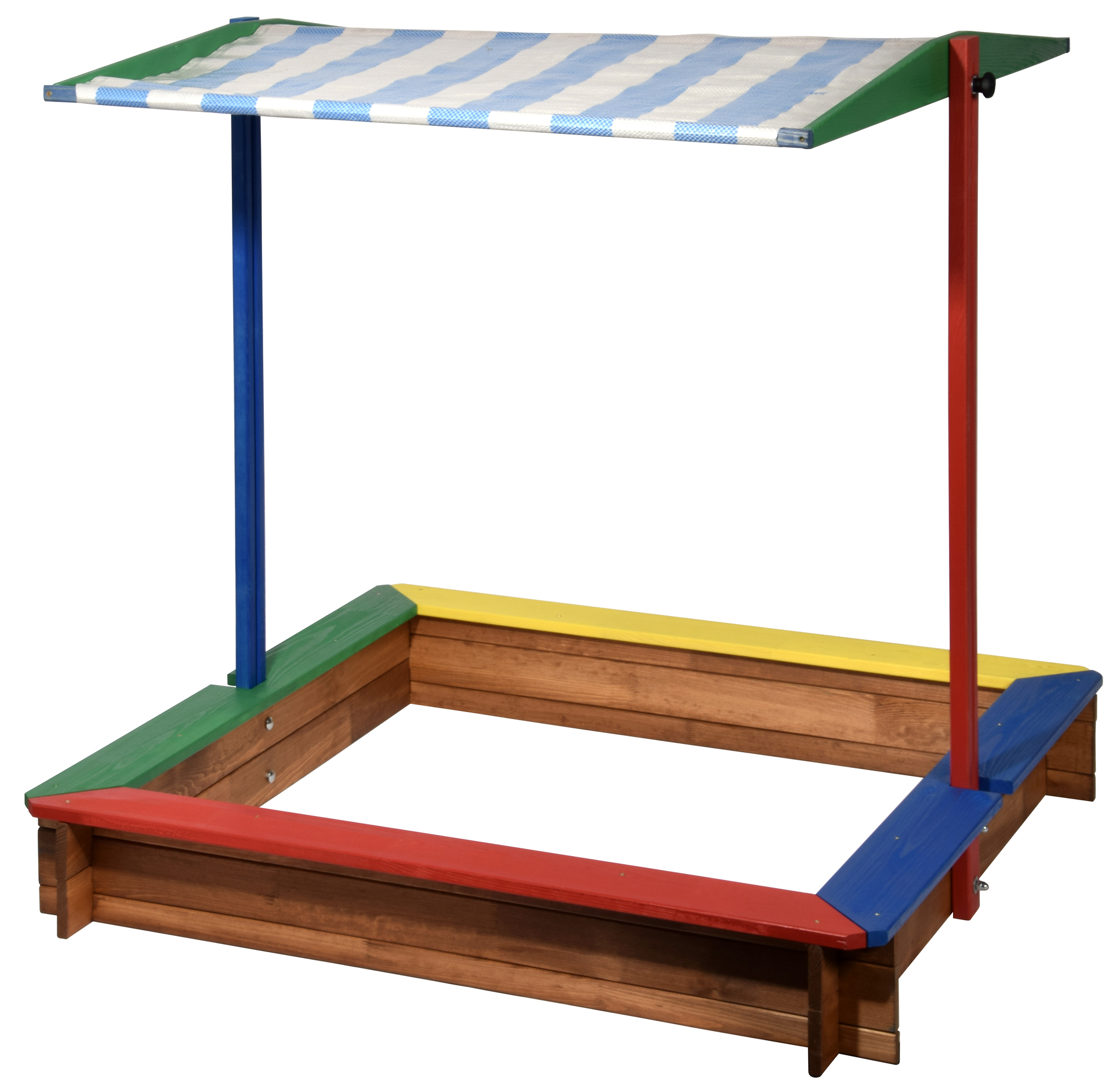 Sandkasten farbig mit Sonnenschutz. Maße aufgebaut ca: 120x120x120 cm. Das schwenkbare Dach bietet Schutz vor UV Strahlen und kann dem Stand der Sonne angepasst werden. Ganz heruntergelassen dient es als Abdeckung für den Sandkasten.