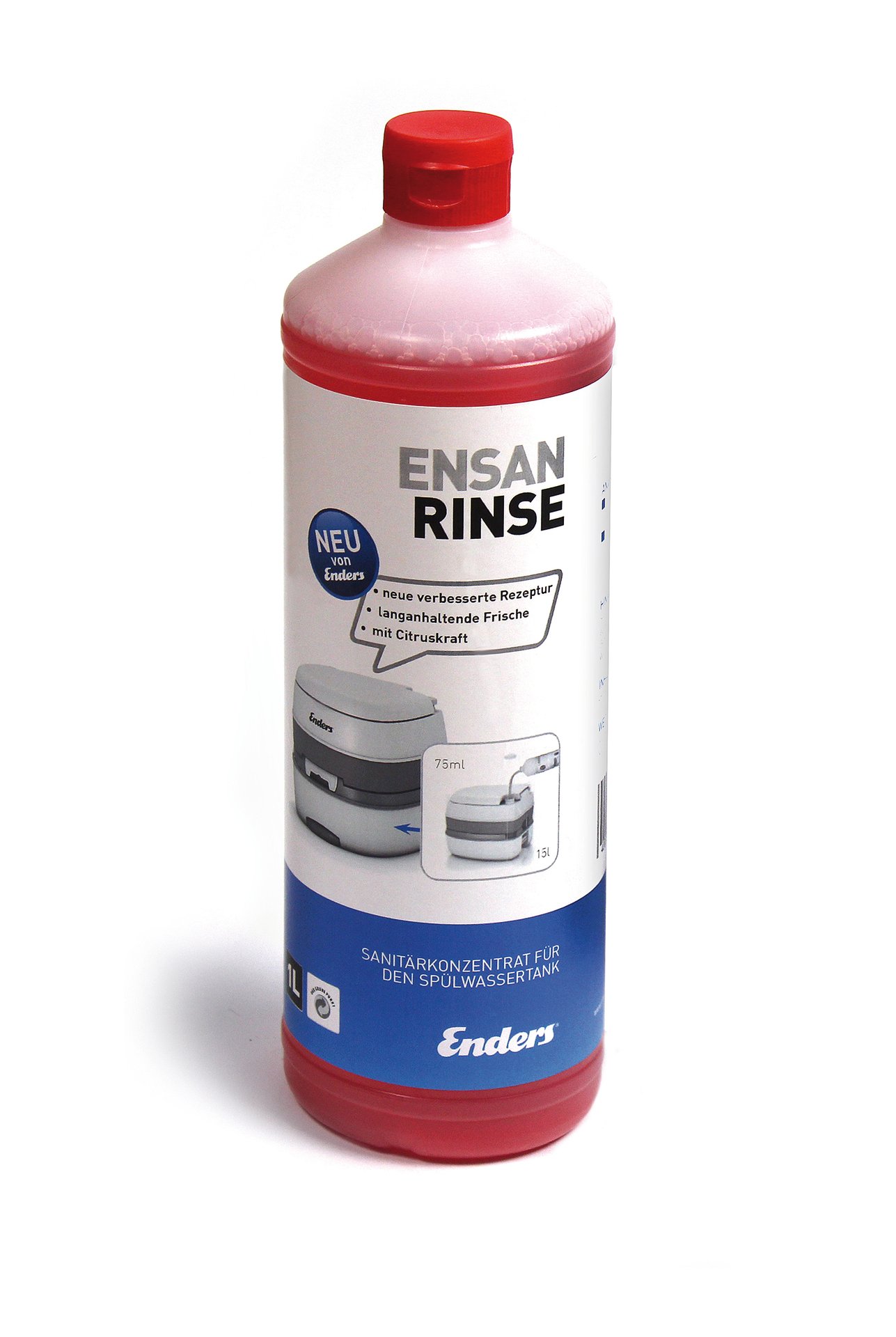 Die Enders Sanitärflüssigkeit Ensan Rinse wird dem Spülwasser beigefügt und reinigt dabei bei jedem Spülgang Becken und Schieber. Das Reinigungsmittel entfernt Wasserstein, beugt neuem Kalkansatz vor und reduziert die Gasbildung. Darüber hinaus sorgt Ensan Rinse für ein reibungsloses Funktionieren des Absperrschiebers und die Schonung aller Gummidichtungen. Außerdem werden unangenehme Gerüche verhindert, da die Sanitärflüssigkeit angenehme und langanhaltende Citrusfrische verbreitet.