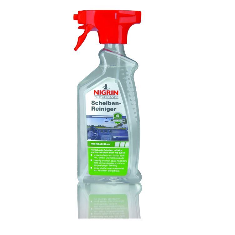 – Scheiben-Reiniger auf ein NIGRIN Mikrofaser-Tuch sprühen