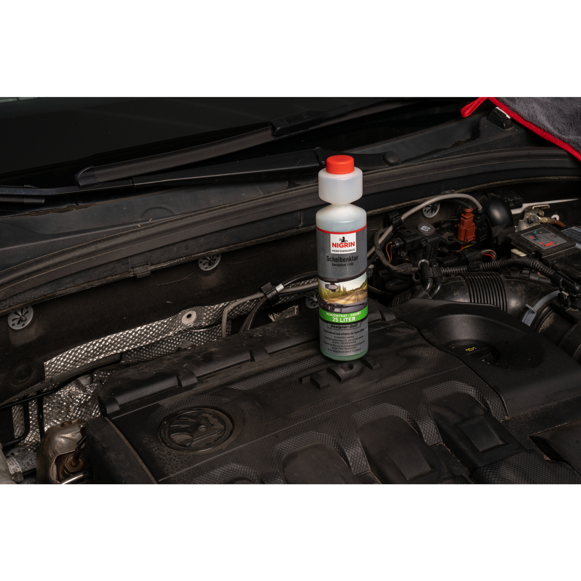 – Pro 2,5Liter Wassermenge einen Dosierkopf (25 ml) NIGRIN Performance Scheibenklar einfüllen