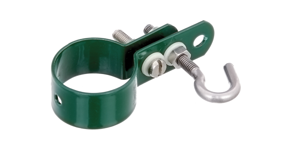 Durch die ersten Maschen des Maschendrahtgeflechts wird der Geflechtspannstab gesteckt. Er wird dann zusammen mit dem Maschendraht in den Haken der Schellen (z.B. 655600 ff) eingehakt.
