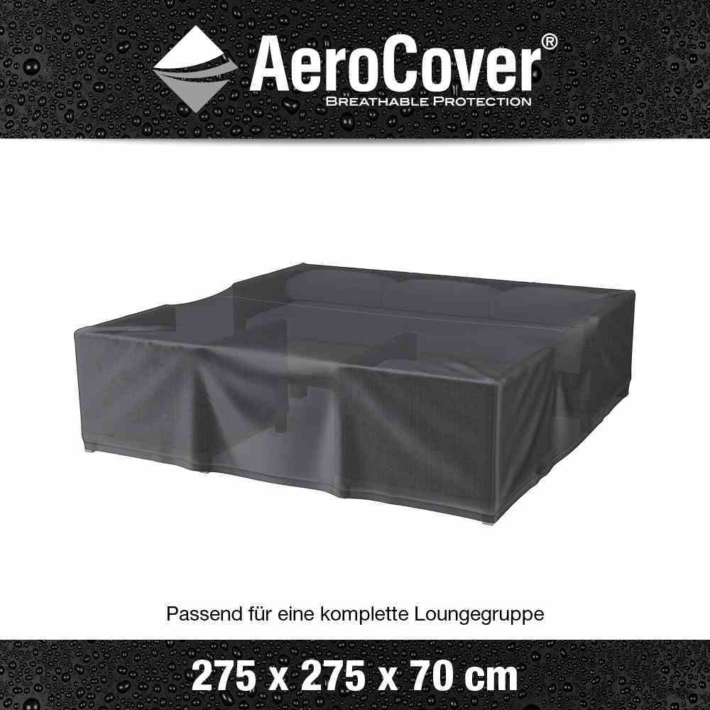 Lounge-Set-Hülle von AeroCover. Atmungsaktive Lounge-Set-Hülle für Lounge-Sets 275x275xH70 cm aus mehreren Teilen, Ecksets mit hohem Tisch oder L-förmigen Sets, die zusammengeschoben werden. Das atmungsaktive AeroCover-Gewebe ist wasserbeständig und reduziert die Kondensbildung, wodurch der Bildung von Schimmel vorgebeugt wird. AeroCover Schutzhüllen verlängern die Lebensdauer Ihrer Gartenmöbel. AeroCovers sind aus leichtem Ripstop Polyester mit einer integrierten, atmungsaktiven Membran hergestellt. Dank des dünnen Gewebes sind diese Hüllen besonders handlich in der Anwendung. Bei Nichtgebrauch sind sie platzsparend aufzubewahren und nehmen, auch dank der integrierten Aufbewahrungstasche, sehr wenig Platz ein. Die Hülle ist mit einem Zugband mit zwei Stoppern ausgestattet, so dass eine optimale Befestigung sichergestellt ist. Das AeroCover-Gewebe ist 100% wasserdicht, die Nähte sind spritzwasserfest.