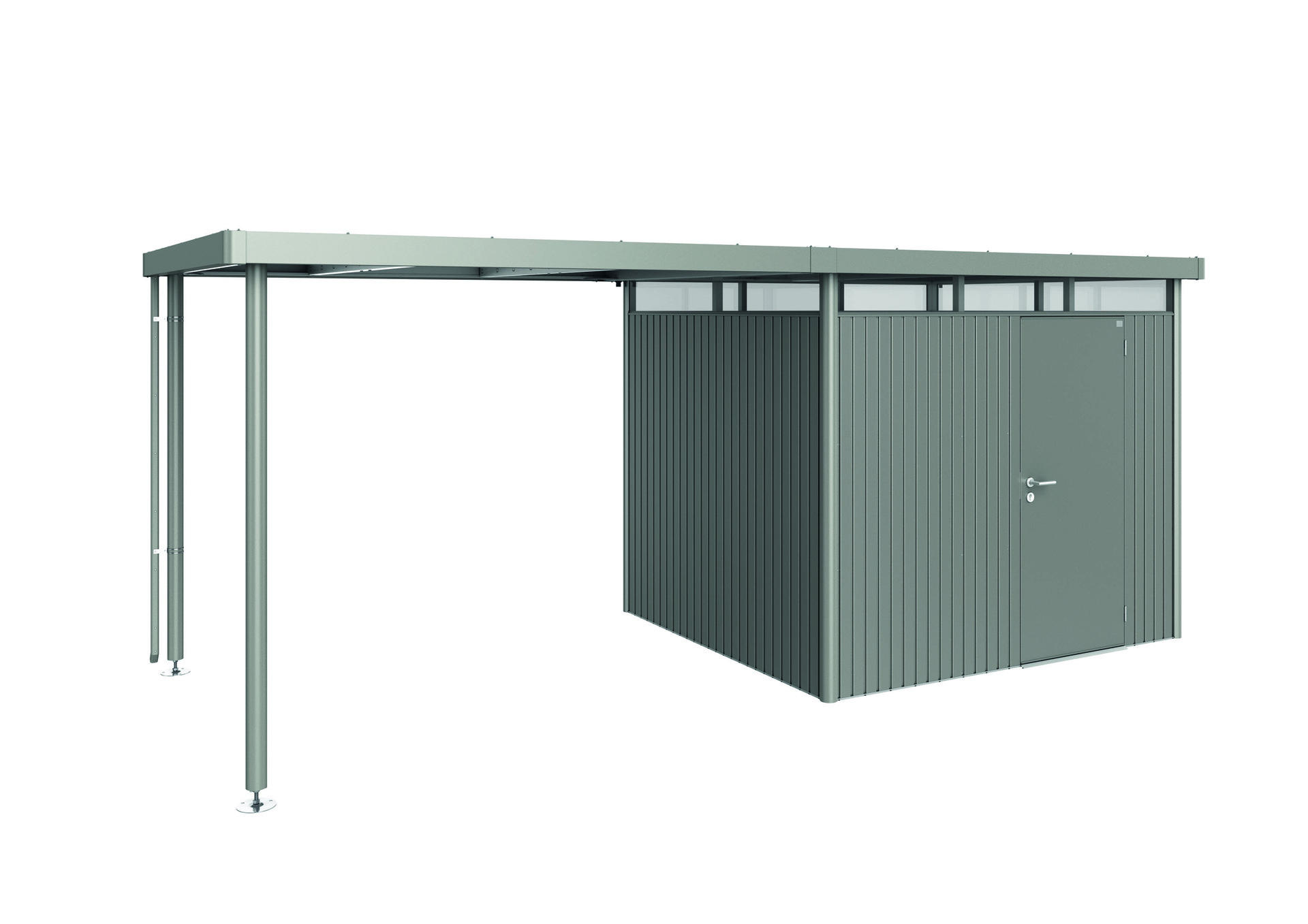 Das Seitendach wird am Gerätehaus HighLine® (ab Gr. H2) jeweils an der Seite mit der Regenrinne – wahlweise ein- oder beidseitig – fixiert. So entsteht eine überdachte Freifläche im Ausmaß der einfachen/doppelten Grundfläche des Gerätehauses. Die Alu-Stützen sind mit höhenverstellbaren Füßen ausgestattet. Regenfallrohr inkl. Die Dachfläche des Seitendaches ist immer quarzgrau-metallic!