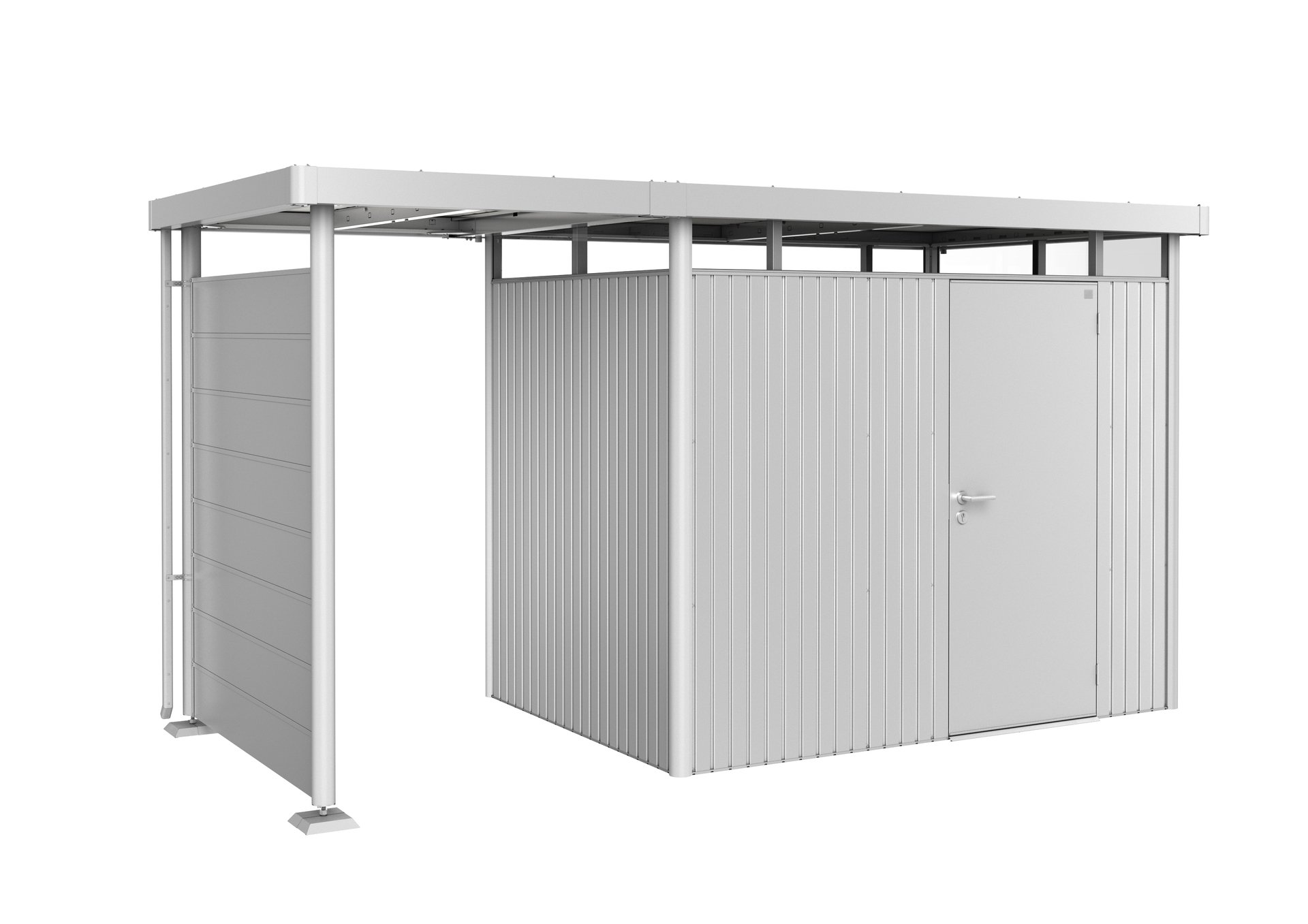 Das Seitendach wird am Gerätehaus HighLine® (ab Gr. H2) jeweils an der Seite mit der Regenrinne – wahlweise ein- oder beidseitig – fixiert. Die Breite des Seitendaches Gr. S beträgt 150 cm und bei Gr. L 282 cm. Die Alu-Stützen sind mit höhenverstellbaren Füßen ausgestattet. Das Regenfallrohr ist inkludiert.
