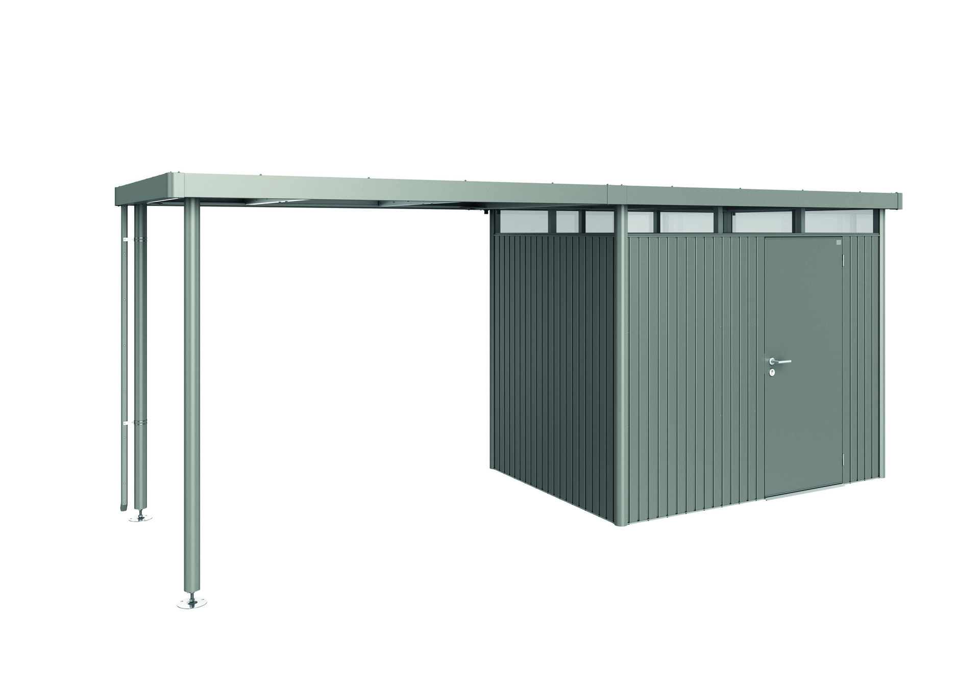 Das Seitendach wird am Gerätehaus HighLine® (ab Gr. H2) jeweils an der Seite mit der Regenrinne – wahlweise ein- oder beidseitig – fixiert. So entsteht eine überdachte Freifläche im Ausmaß der einfachen/doppelten Grundfläche des Gerätehauses. Die Alu-Stützen sind mit höhenverstellbaren Füßen ausgestattet. Regenfallrohr inkl. Die Dachfläche des Seitendaches ist immer quarzgrau-metallic!