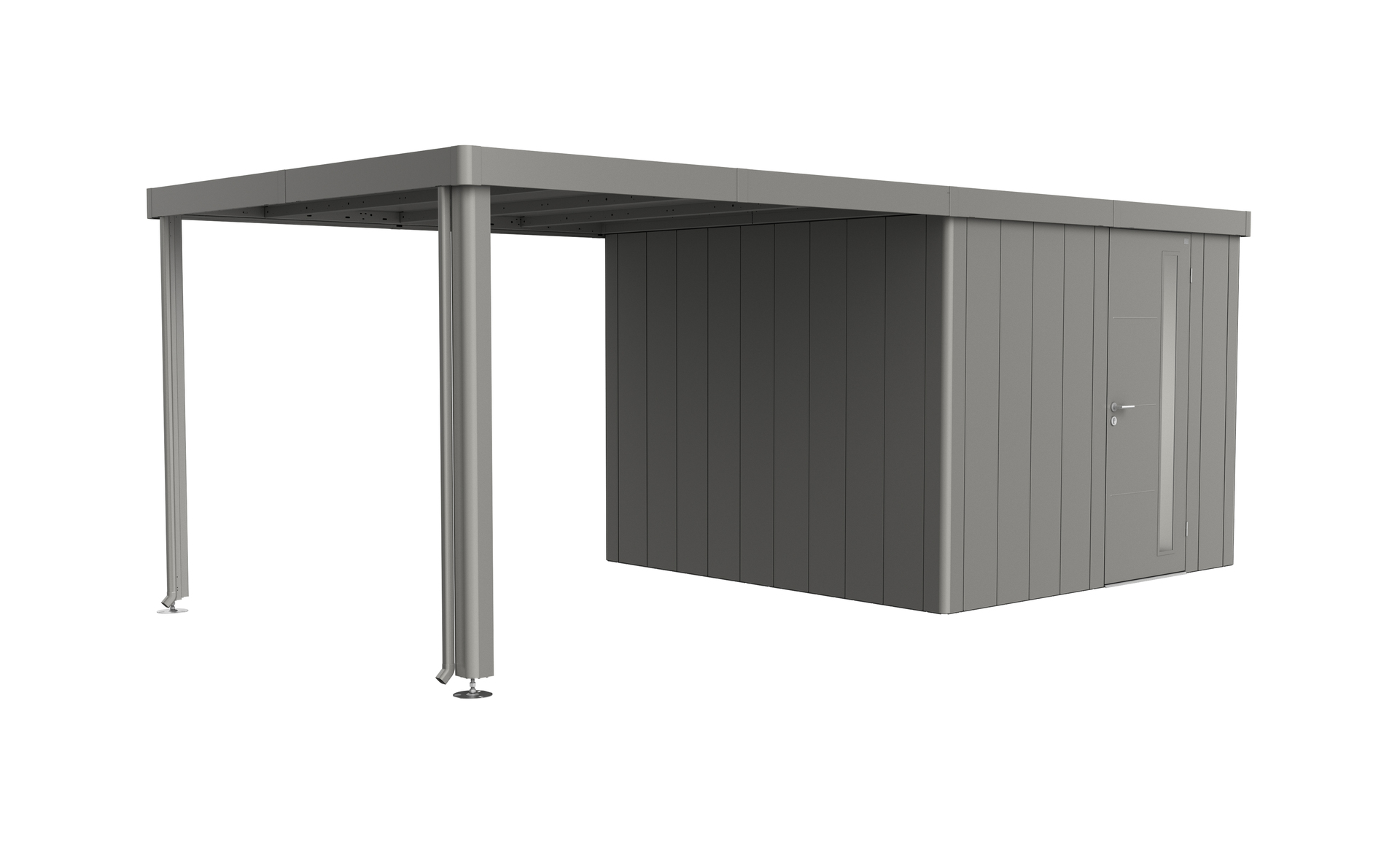 Das Seitendach wird am Gerätehaus Neo (ab Gr. 2A) wahlweise ein- oder beidseitig – fixiert. Die Breite des Seitendaches liegt bei 3 m. Die Alu-Stützen sind mit höhenverstellbaren Füßen ausgestattet. Zwei Regenfallrohre sind inkludiert.