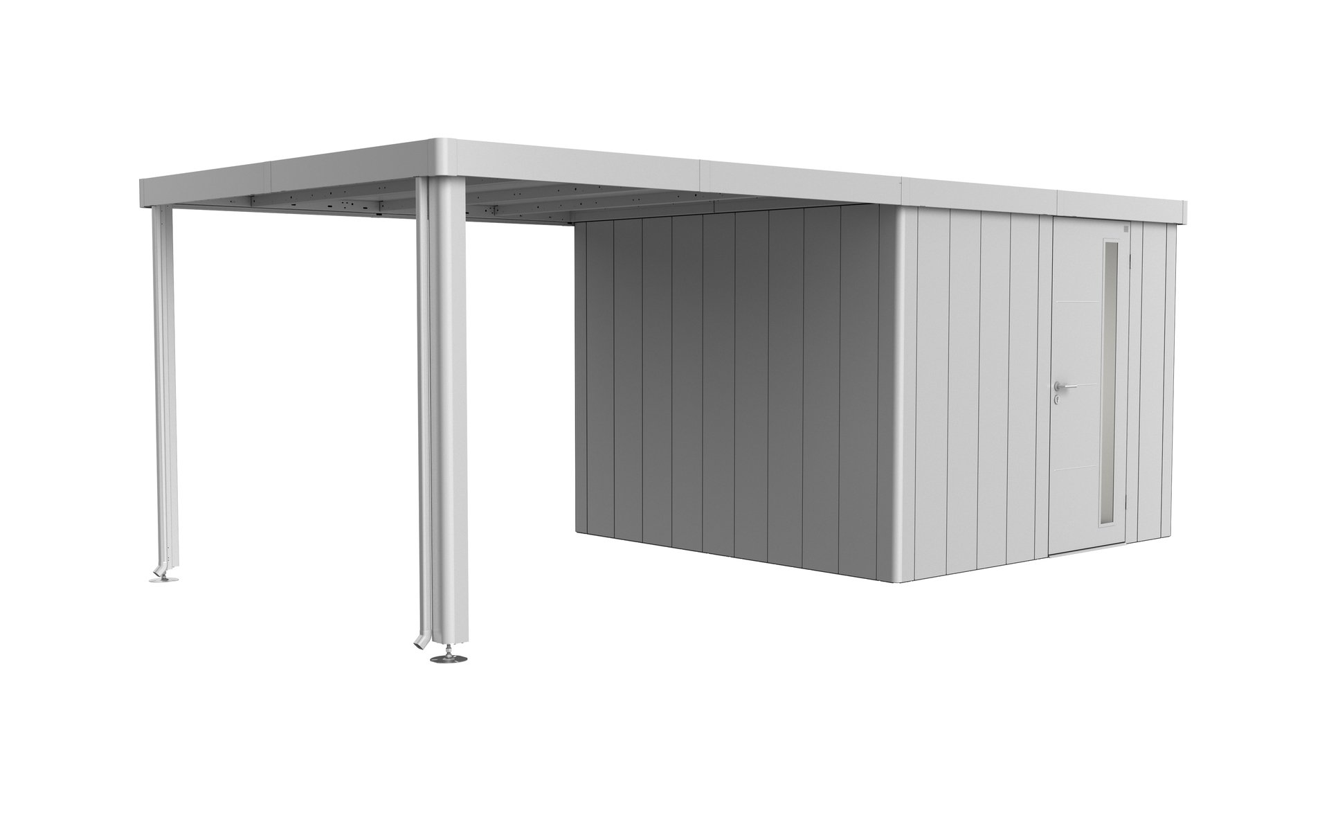 Das Seitendach wird am Gerätehaus Neo (ab Gr. 2A) wahlweise ein- oder beidseitig – fixiert. Die Breite des Seitendaches liegt bei 3 m. Die Alu-Stützen sind mit höhenverstellbaren Füßen ausgestattet. Zwei Regenfallrohre sind inkludiert.