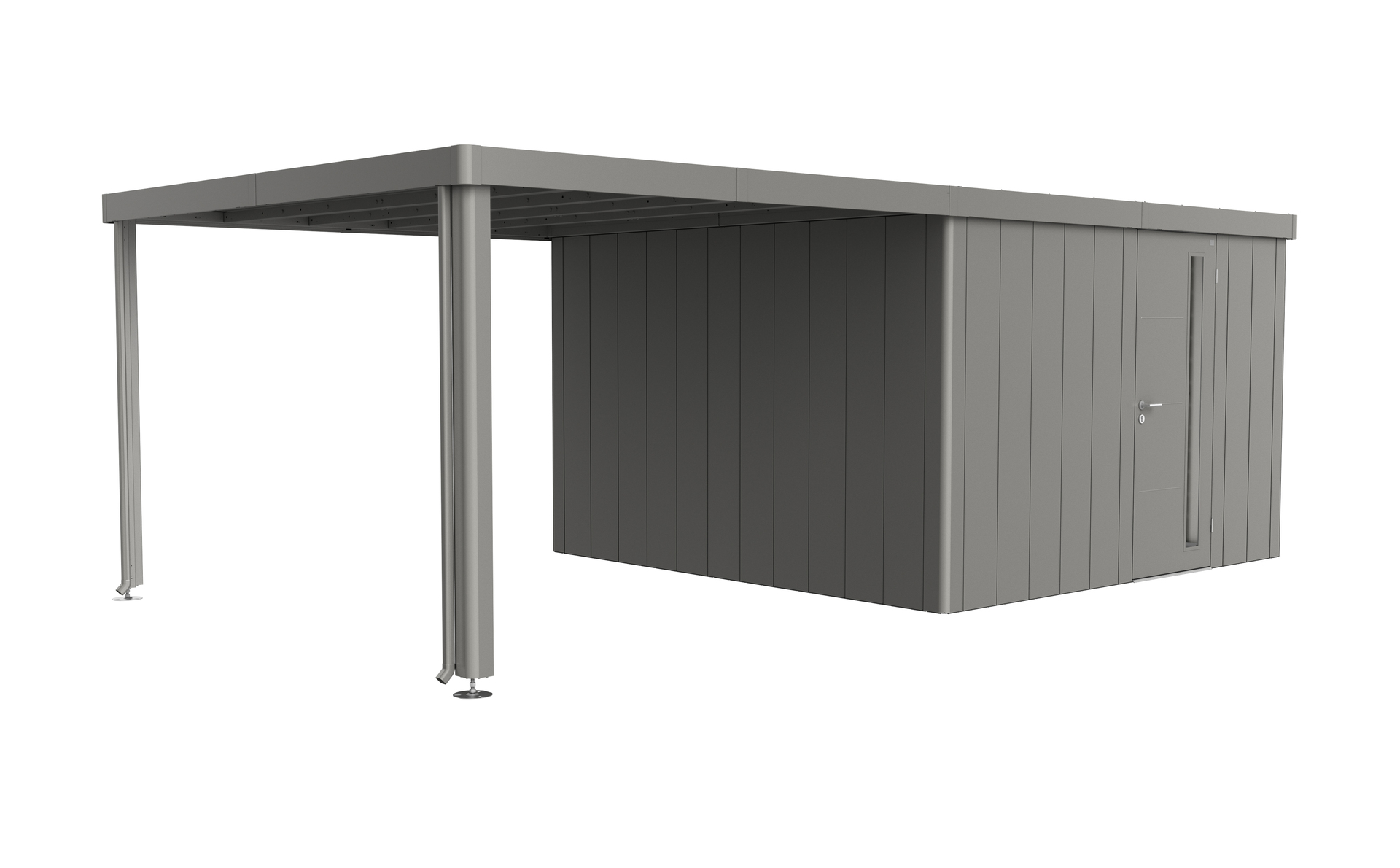 Das Seitendach wird am Gerätehaus Neo (ab Gr. 2A) wahlweise ein- oder beidseitig – fixiert. Die Breite des Seitendaches liegt bei 3 m. Die Alu-Stützen sind mit höhenverstellbaren Füßen ausgestattet. Zwei Regenfallrohre sind inkludiert.