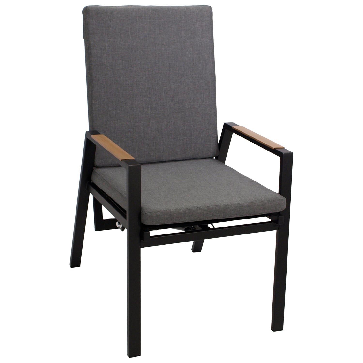 Sessel Hochlehner, Aluminium anthrazit pulverbeschichtet, Armlehnen Aluminium in Holzoptik, stufenlos verstellbar, mit Auflagen grau. Materialzusammensetzung Bezüge: 100% Polypropylen.