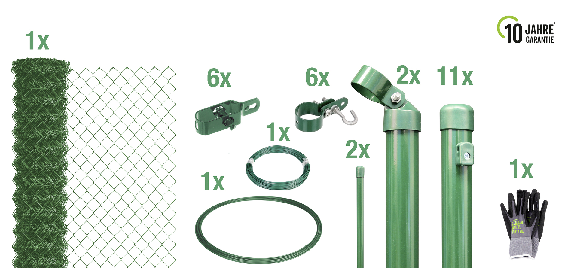 1x Maschendraht-Geflecht – 11x Zaunpfosten – 2x Streben – 6x Drahtspanner – 1x Spanndraht – 1x Bindedraht – 2x Geflechtspannstäbe – 6x Schellen
