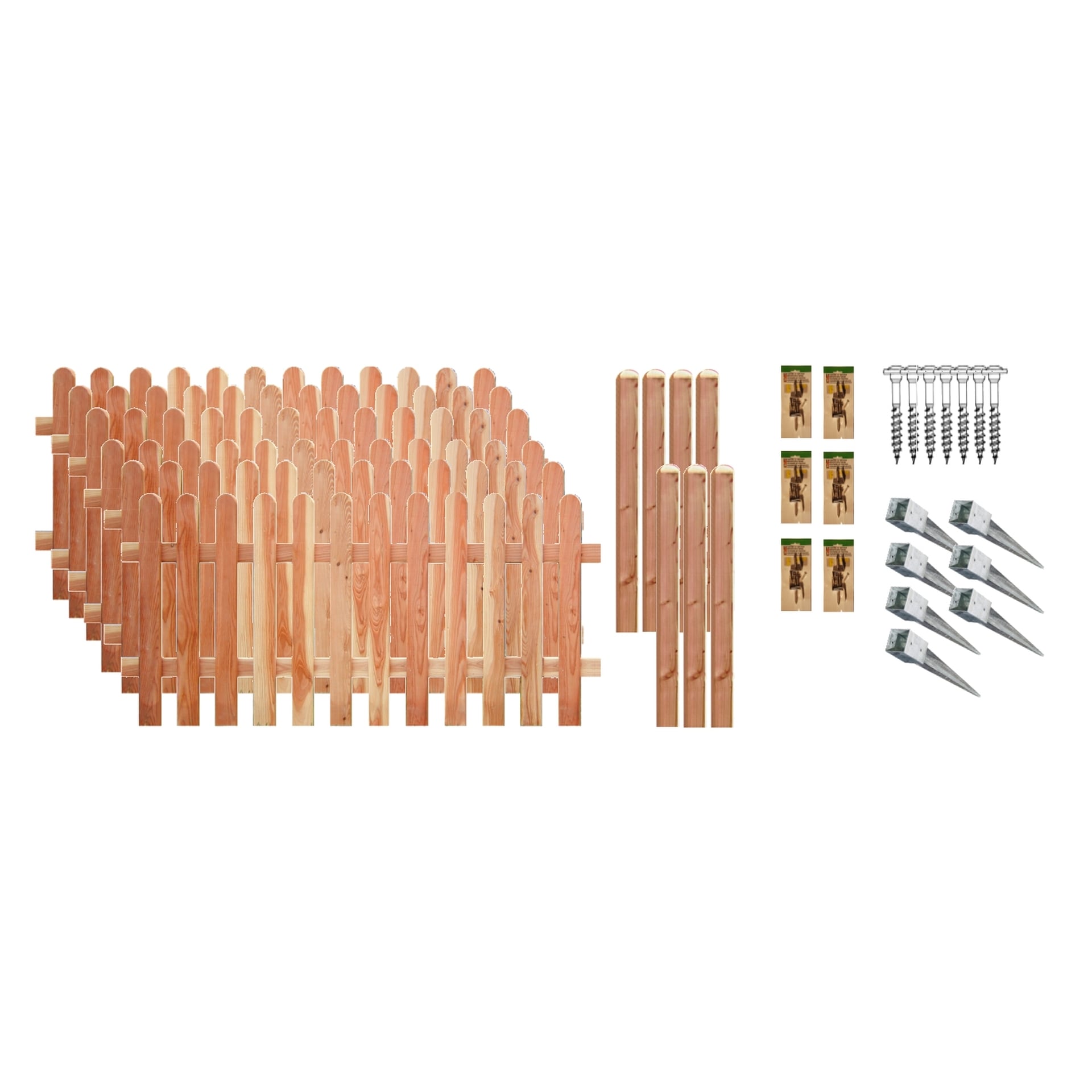 6 Elemente 180×80 cm; 7 Pfosten 9x9x100 cm Kopf gerundet; 7 Einschlaghülsen, 6 Pakete L-Beschläge mit Schrauben; 7 Pakete Schrauben für Bodenhülsen.