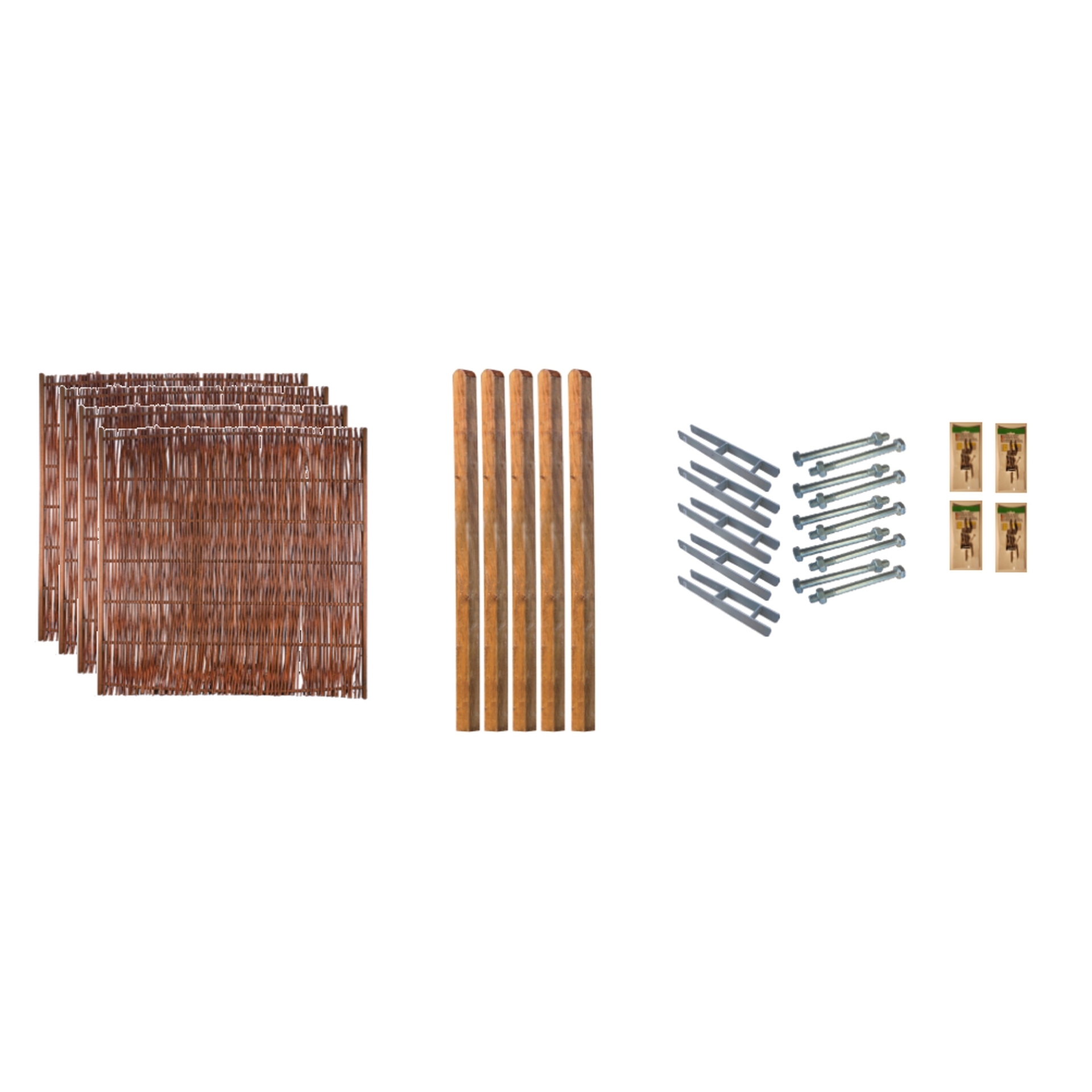 4 Elemente 180×180 cm; 5 Pfosten 9x9x190 cm gerundet; 5 H-Pfostenträger, 4 Pakete L-Beschläge mit Schrauben; 5 Pakete Durchgangsschrauben. Achtung: Biozidprodukte vorsichtig verwenden. Vor Gebrauch stets Etikett und Produktinformationen lesen.