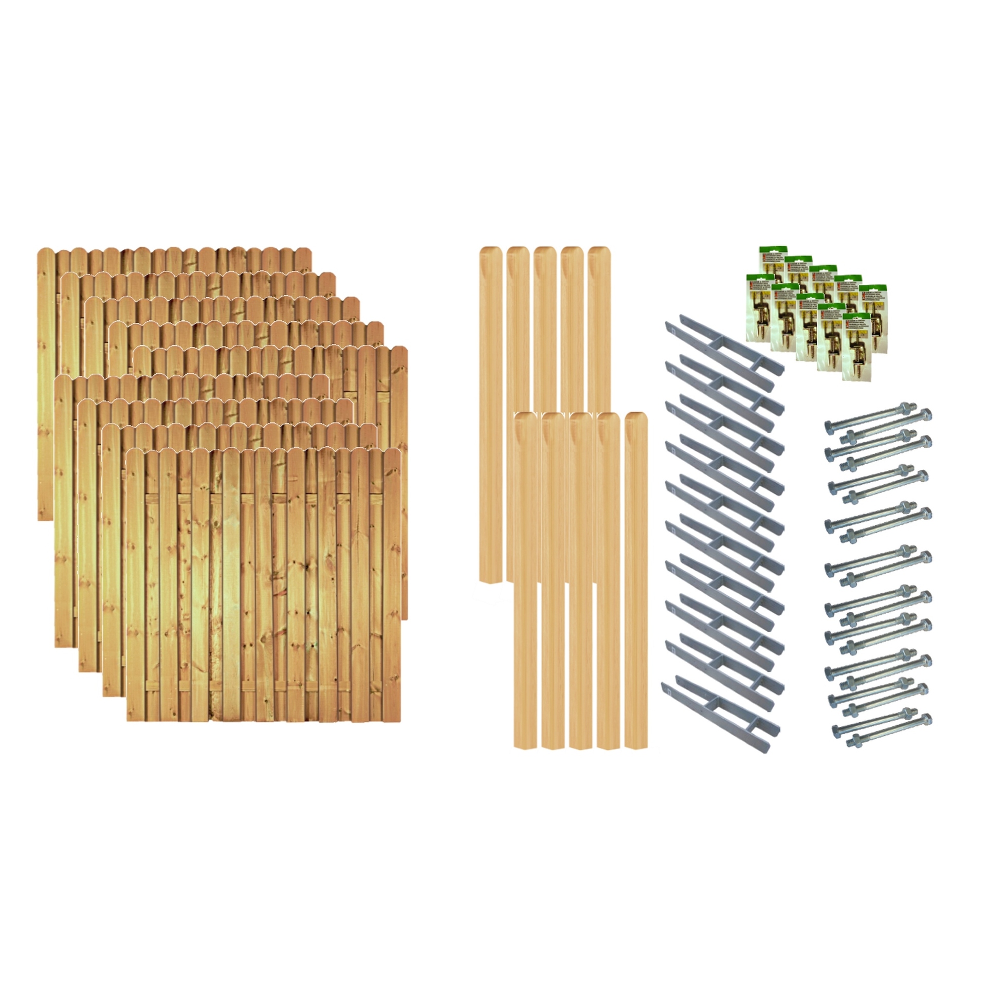 9 Elemente 180×180 cm; 10 Pfosten 9x9x190 cm gerundet; 10 H-Pfostenträger, 9 Pakete L-Beschläge mit Schrauben; 10 Pakete Durchgangsschrauben. Achtung: Biozidprodukte vorsichtig verwenden. Vor Gebrauch stets Etikett und Produktinformationen lesen.