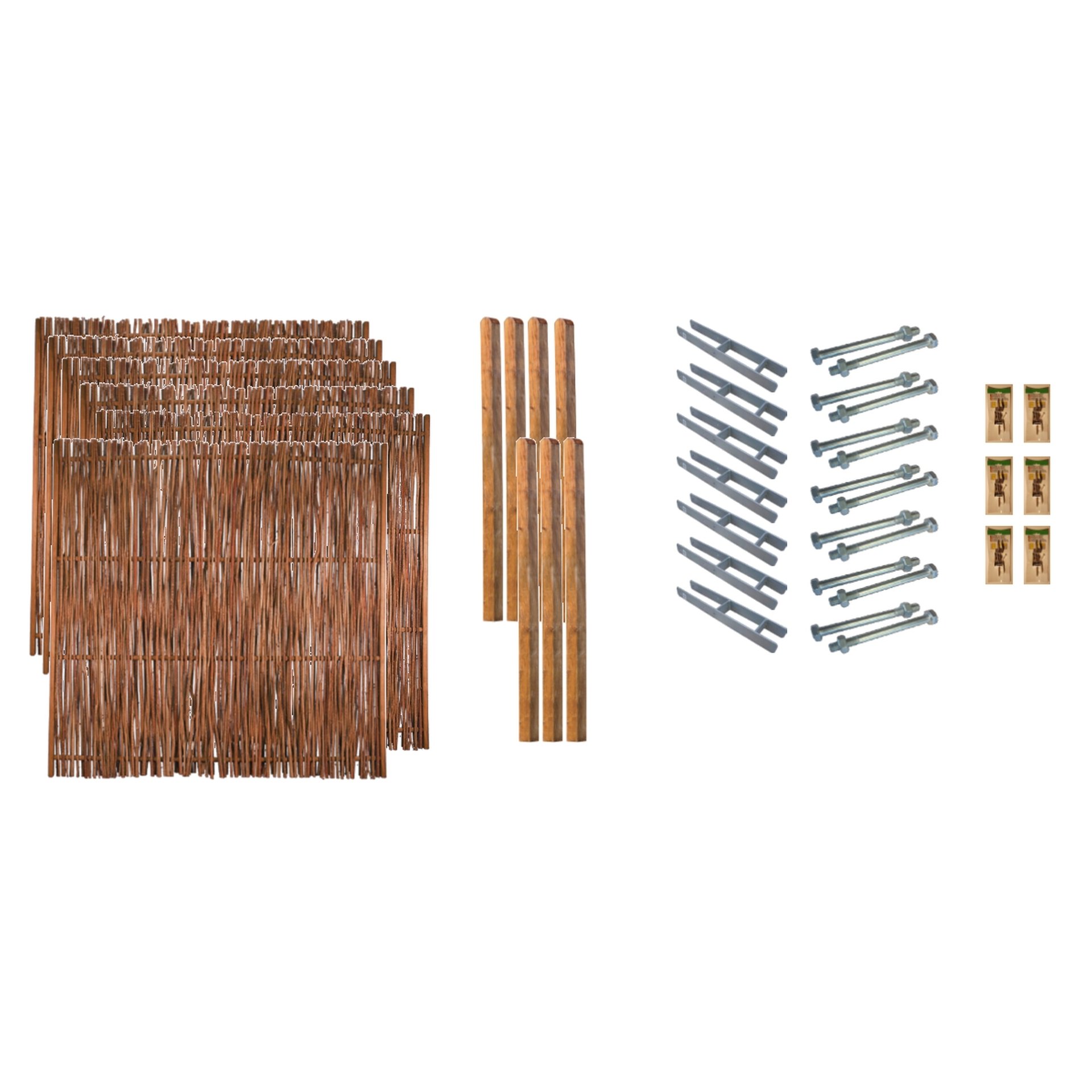 6 Elemente 180×180 cm; 7 Pfosten 9x9x190 cm gerundet; 7 H-Pfostenträger, 6 Pakete L-Beschläge mit Schrauben; 7 Pakete Durchgangsschrauben. Achtung: Biozidprodukte vorsichtig verwenden. Vor Gebrauch stets Etikett und Produktinformationen lesen.