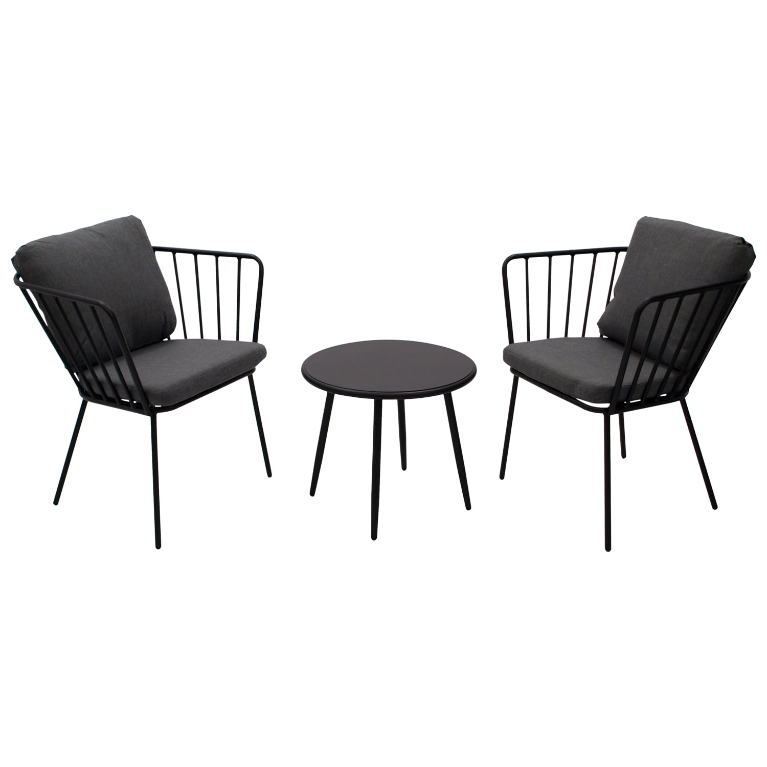 Garnitur 3-teilig bestehend aus 2x Sessel und 1x Tisch 52cm rund, aus pulverbeschichtetem Stahl, Farbe anthrazit, mit Polstern grau. Materialzusammensetzung Bezüge: 100% Polypropylen.
