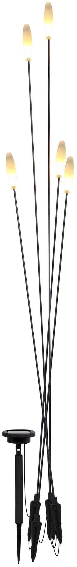 Die 5-er Solarleuchte ist ein simmungsvoller Hingucker im Garten und mit der Schutzklasse IP44 ausgestattet. Die schwarze Metallleuchte ist unabhängig von jeglicher Stromquelle und lädt sich tagsüber per Sonnenlicht selbst auf, um abends wunderschön Beete, Wegränder und Terrasse zu beleuchten.