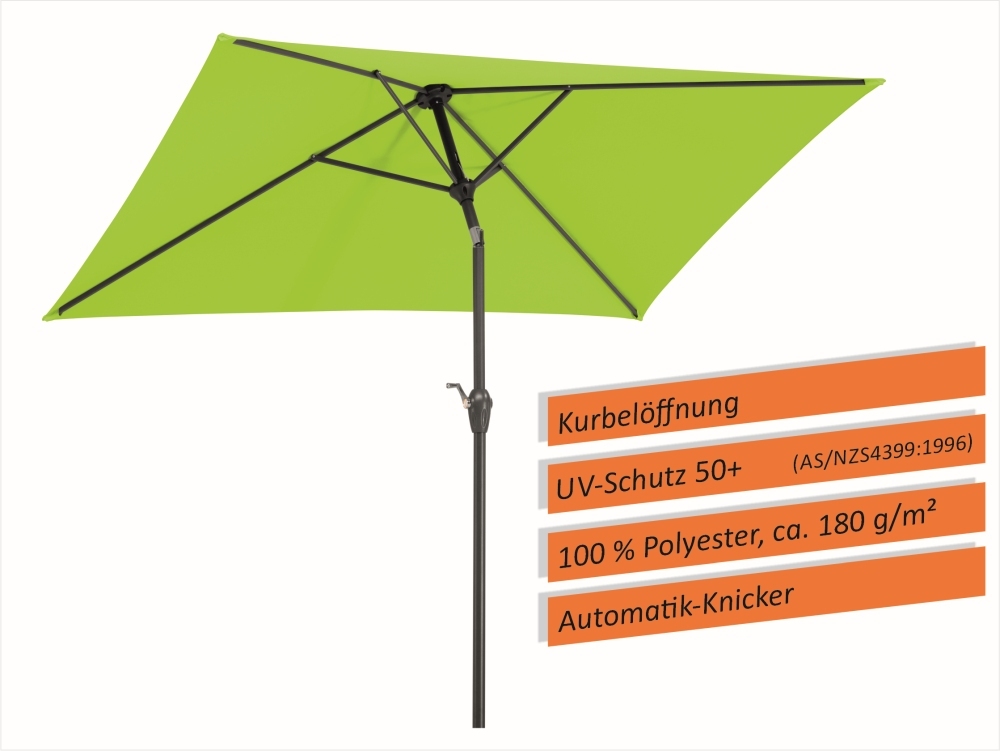 Zudem verfügt der Sonnenschirm Bilbao über einen Automatik-Knicker, welcher durch einfaches „Weiterdrehen“ der Kurbel, aktiviert wird. Somit haben Sie die Möglichkeit den Schirm entsprechend der Sonneneinstrahlung auszurichten, um einen optimalen Sonnenschutz zu erreichen.