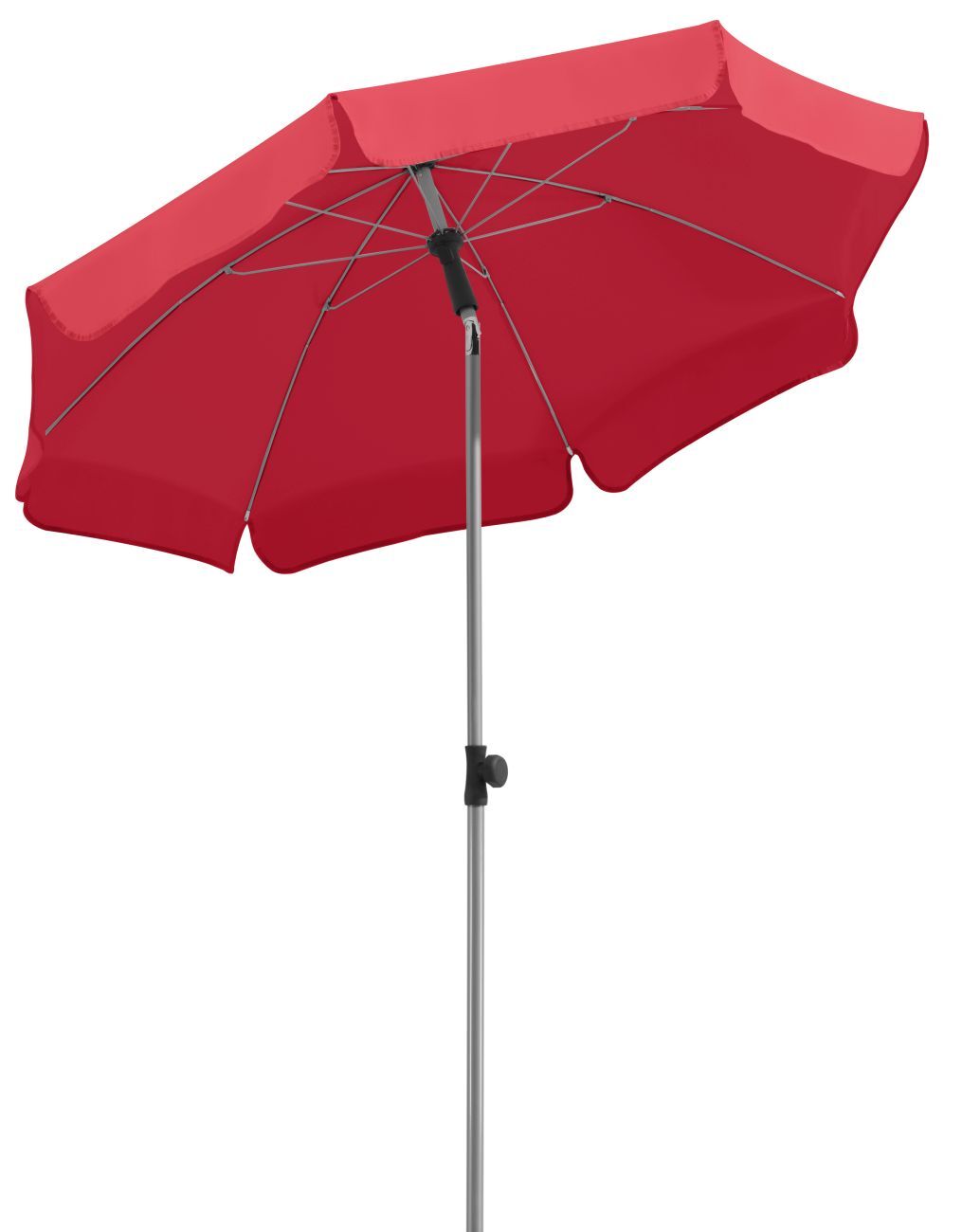 Außerdem besitzt der Schirm einen stabilen Metallknicker mit Druckknopf, wodurch ein müheloses Abknicken gewährleistet wird und der Schirm so entsprechend der Sonneneinstrahlung ausgerichtet werden kann.