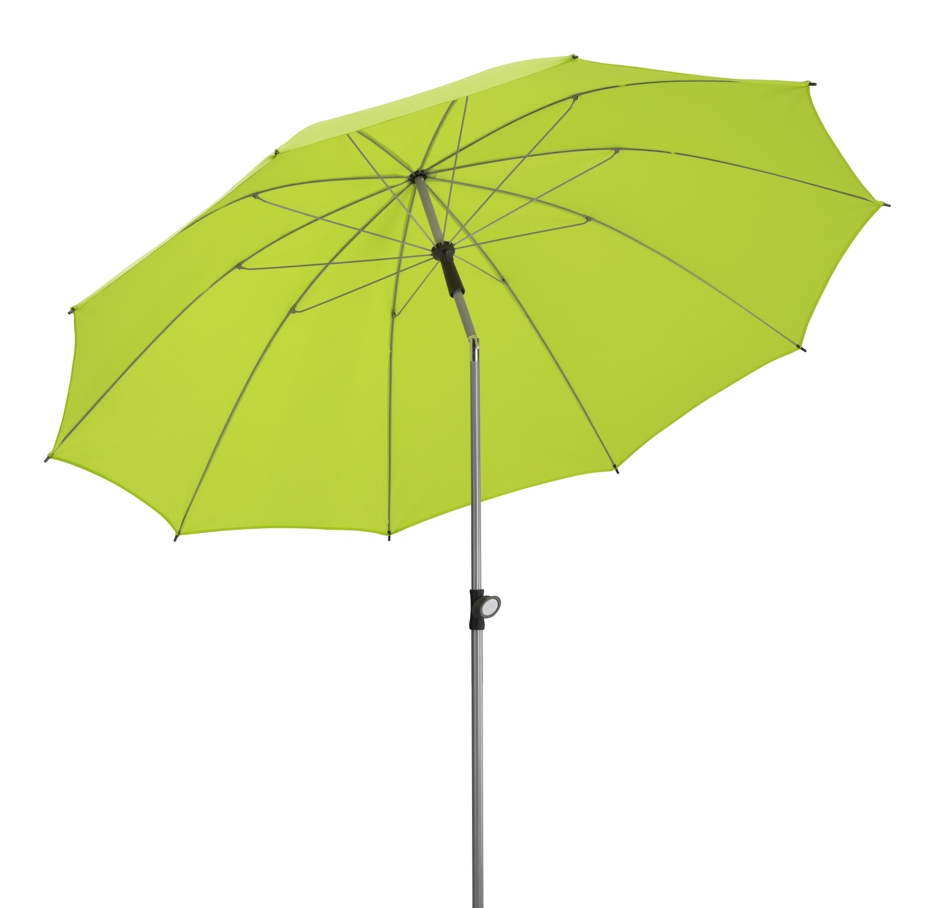 Außerdem besitzt der Schirm einen stabilen Metall-Knicker mit Druckknopf, wodurch ein müheloses Abknicken gewährleistet wird und der Schirm so entsprechend der Sonneneinstrahlung ausgerichtet werden kann.